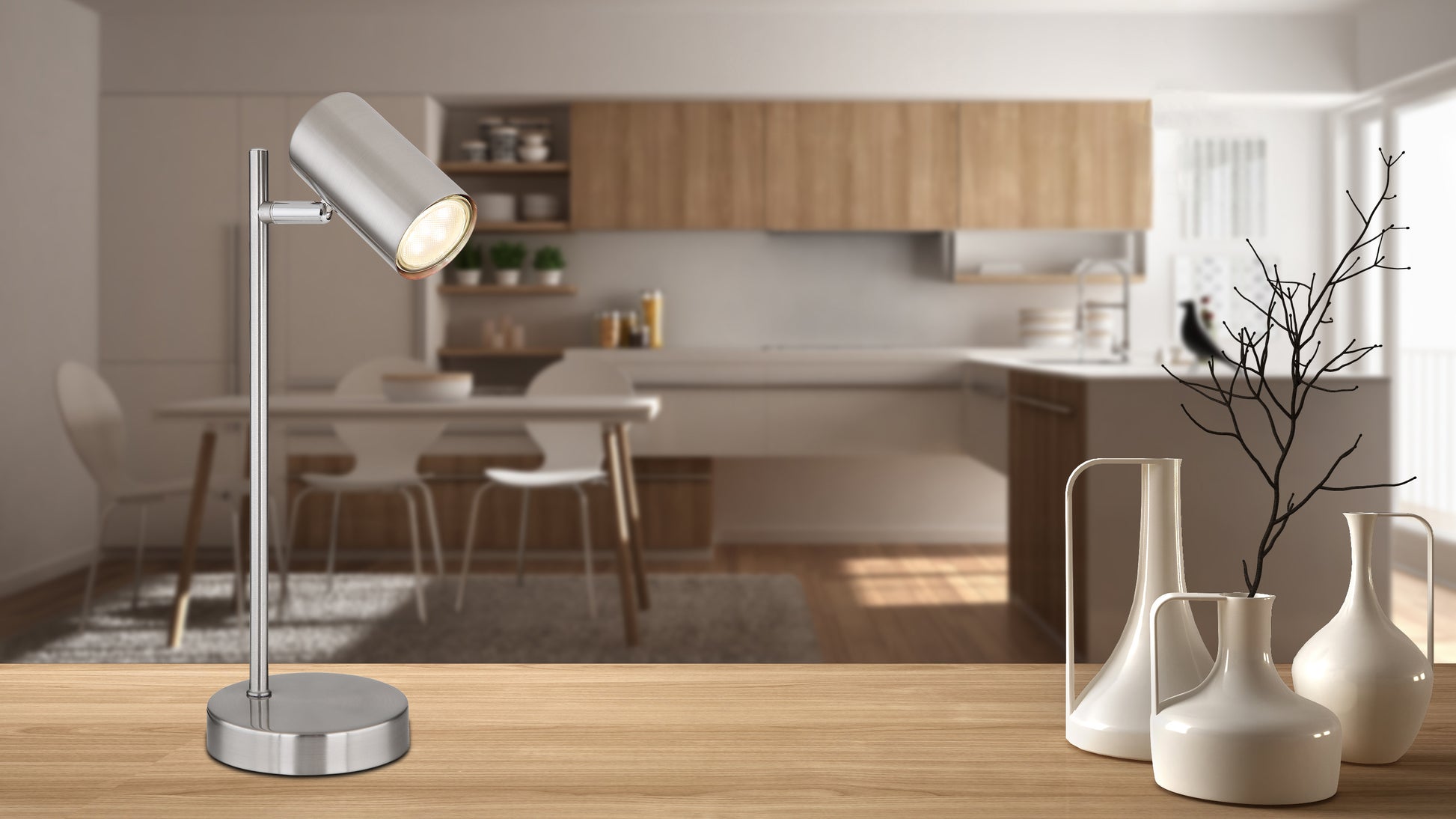 Diese 35 cm große Tischlampe aus der Robby-Serie (ø 12 cm) ist eine wunderbare Ergänzung für Ihre Innenräume. Die aus nickel-mattem Metall gefertigte Tischleuchte besteht aus einem runden Metallsockel, an dem ein Stab mit einer schwenkbaren, von Metall ummantelten GU10-Fassung fixiert ist. Diese können mit einem LED-Leuchtmittel Ihrer Wahl bestückt werden, wodurch Sie die Möglichkeit haben, Lichtfarbe und Helligkeit individuell zu bestimmen. Außerdem verfügt sie über einen inkludierten Schalter, mit dem die Leuchte bequem ein- und ausgeschaltet werden kann. Durch weitere Modelle der gleichen Serie können Sie das Gesamtbild in Ihren vier Wänden komplettieren.