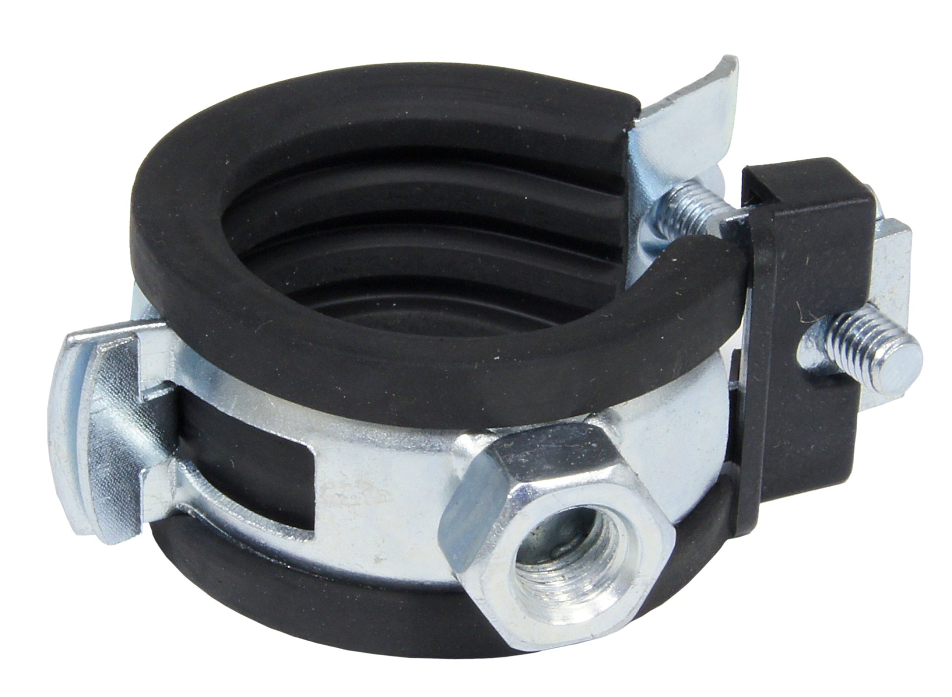 Stahl/Gummi" Verzinkt" Schallgedämmt, gefertigt nach DIN 4109" Aufklappbar" Temperaturbeständig -40°C bis +100°C" Brandverhalten, gefertigt nach DIN 4102" Mutter M8" Einfache Montage" ø 28 mm, 3/4"