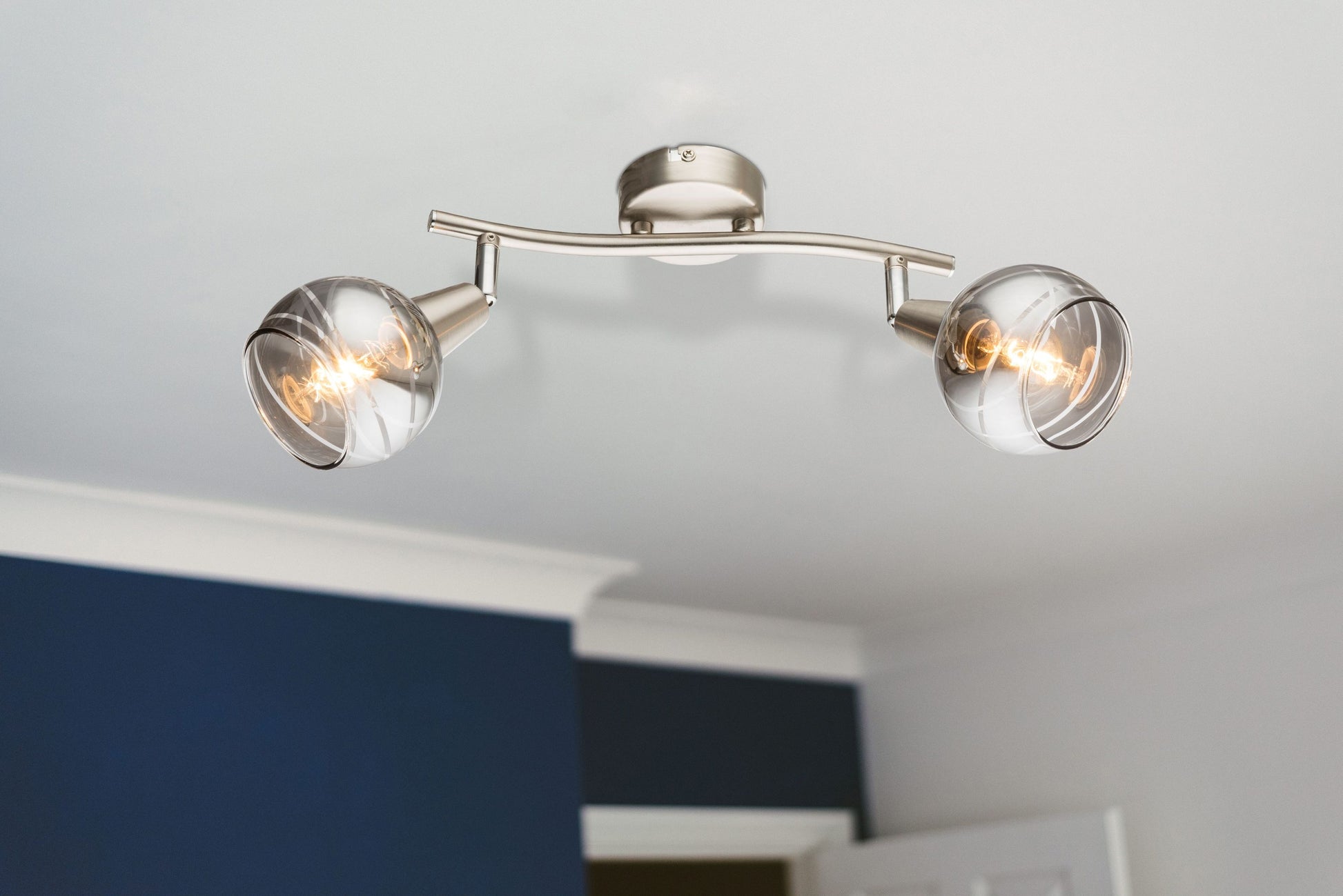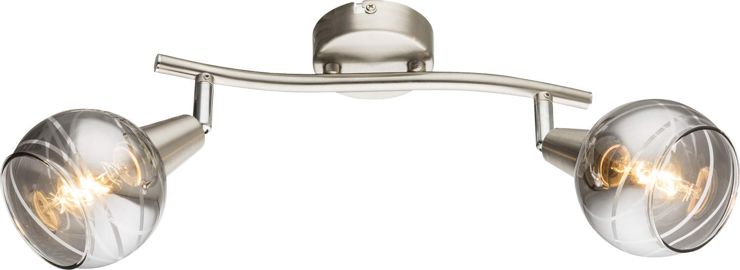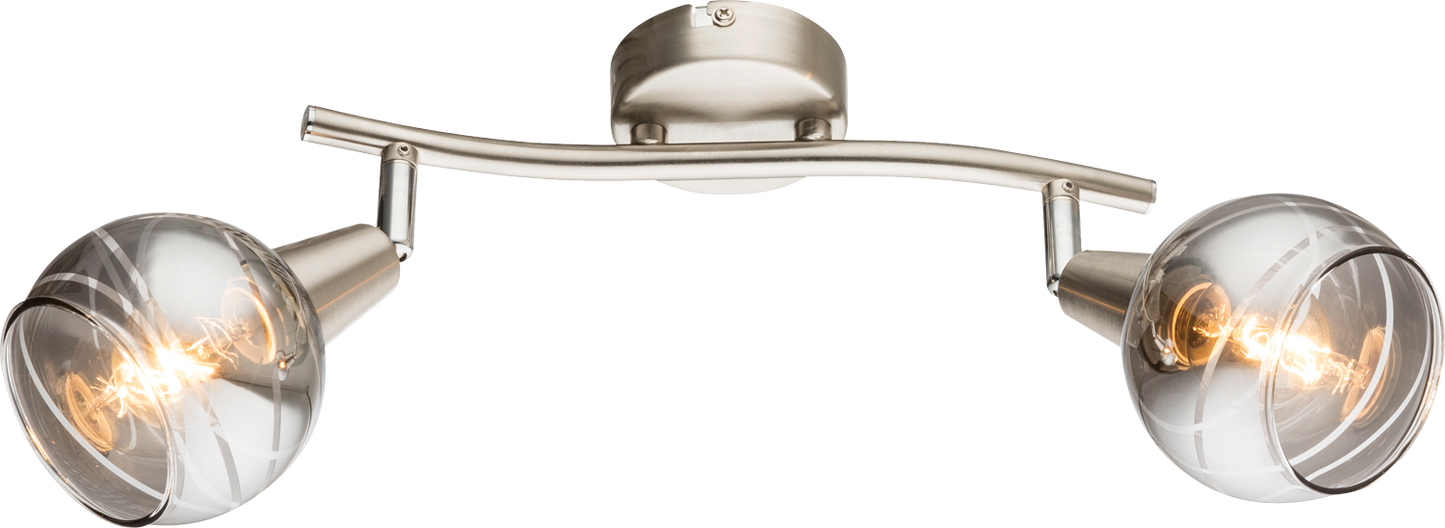 Dieser nickel matte Strahler bekommt durch sein Design einen rauchigen Touch. Zwei Strahler sind jeweils am Ende einer nickel matten Stange befestigt. Der Schirm dieser Strahler besteht aus klaren Rauchglas und durch feine Dekorlinien am Schirm bekommt er seinen Eleganz. Das 800 Lumen starke und 3000K warmweißs Licht der inkludierten LED Leuchtmittel rundet das Ganze ab. Die Lampe hat eine Länge von 28 cm und durch weitere Modelle dieser Serie können Sie das Bild in ihrem Wohnraum komplettieren.