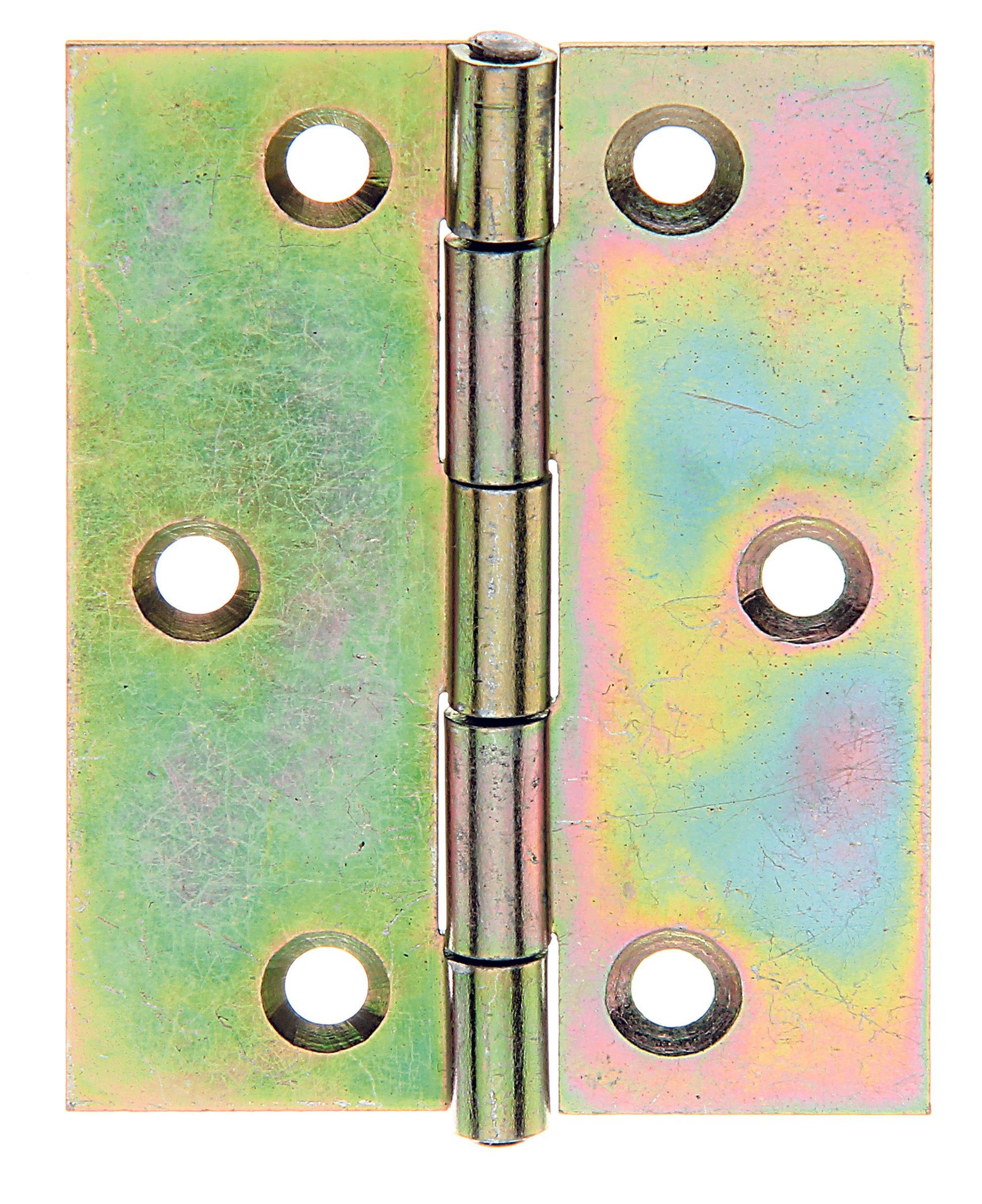 Scharnier, halbbreit, mit vernietetem Edelstahlstift, mit versenkten Schraublöchern, Material: Stahl roh, Oberfläche: galvanisch gelb verzinkt, Länge: 70 mm, Breite: 53 mm, Ausführung: gerollt, Materialstärke: 1,25 mm, Anzahl Löcher: 6, Loch: #5 mm