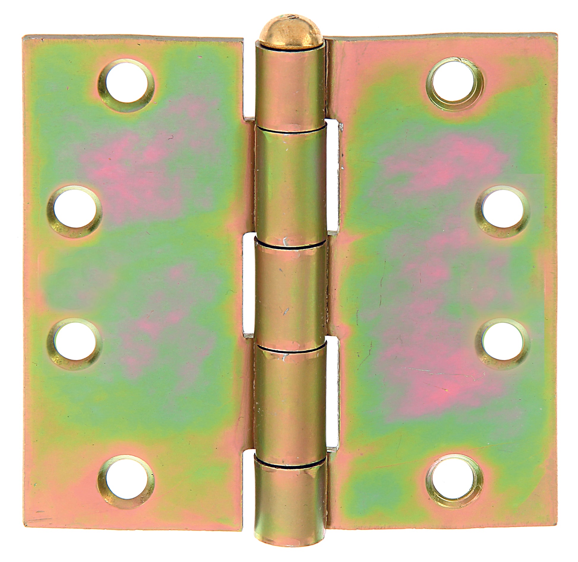 Scharnier, quadratisch, mit versenkten Schraublöchern, Material: Stahl roh, Oberfläche: galvanisch gelb verzinkt, mit vernietetem Edelstahlstift, Länge: 100 mm, Breite: 100 mm, Ausführung: gerollt, Materialstärke: 2,50 mm, Anzahl Löcher: 8, Loch: #5,8 mm