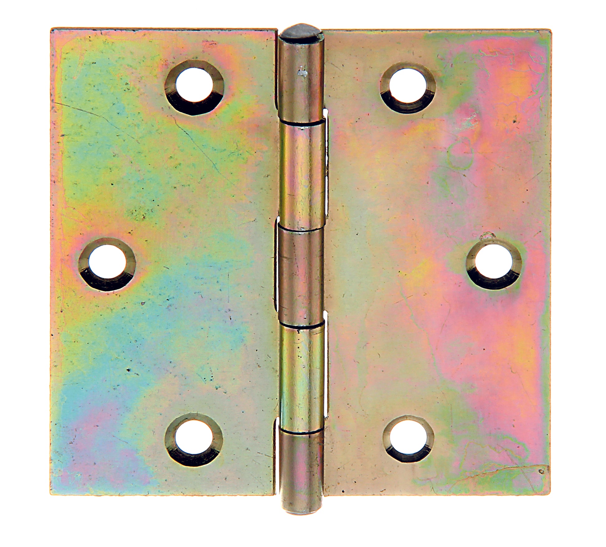 Scharnier, quadratisch, mit versenkten Schraublöchern, Material: Stahl roh, Oberfläche: galvanisch gelb verzinkt, mit vernietetem Edelstahlstift, Länge: 64 mm, Breite: 64 mm, Ausführung: gerollt, Materialstärke: 1,00 mm, Anzahl Löcher: 6, Loch: #4,5 mm