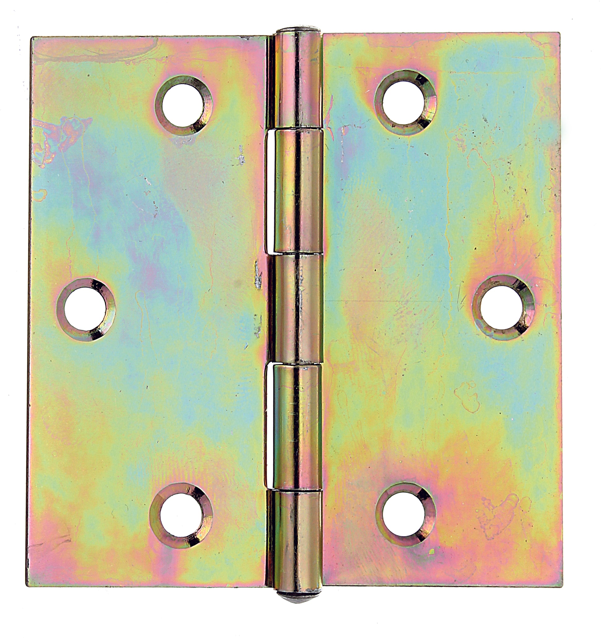 Scharnier, quadratisch, mit versenkten Schraublöchern, Material: Stahl roh, Oberfläche: galvanisch gelb verzinkt, mit vernietetem Edelstahlstift, Länge: 70 mm, Breite: 70 mm, Ausführung: gerollt, Materialstärke: 1,50 mm, Anzahl Löcher: 6, Loch: #5 mm