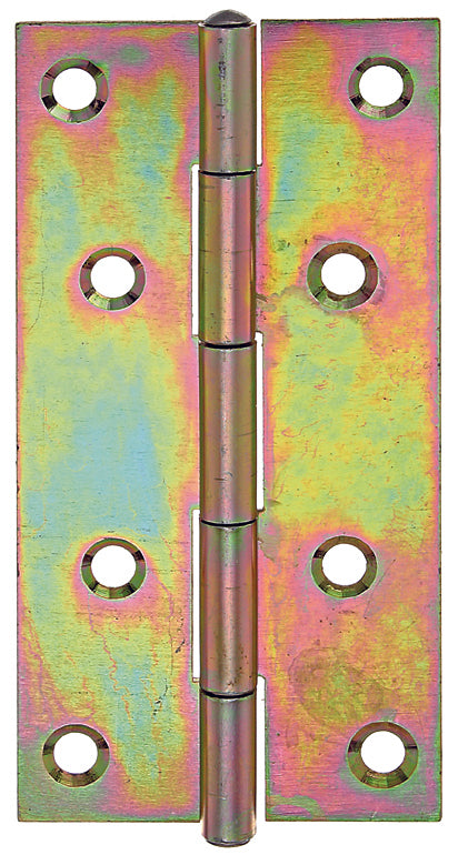 Scharnier, schmal, mit versenkten Schraublöchern, Material: Stahl roh, Oberfläche: galvanisch gelb verzinkt, mit vernietetem Edelstahlstift, Länge: 100 mm, Breite: 49 mm, Ausführung: gerollt, Materialstärke: 1,25 mm, Anzahl Löcher: 8, Loch: #5,2 mm