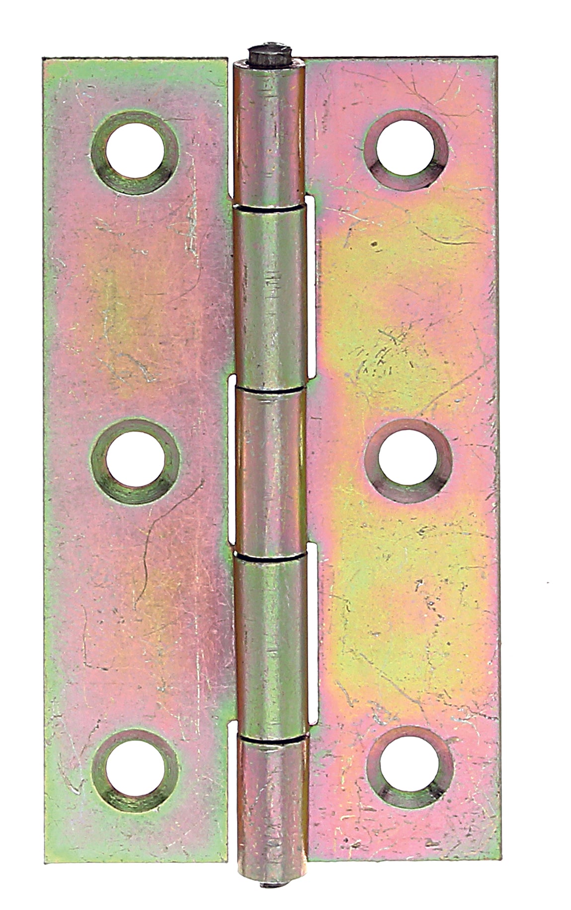 Scharnier, schmal, mit versenkten Schraublöchern, Material: Stahl roh, Oberfläche: galvanisch gelb verzinkt, mit vernietetem Edelstahlstift, Länge: 64 mm, Breite: 34 mm, Ausführung: gerollt, Materialstärke: 1,00 mm, Anzahl Löcher: 6, Loch: #4,3 mm