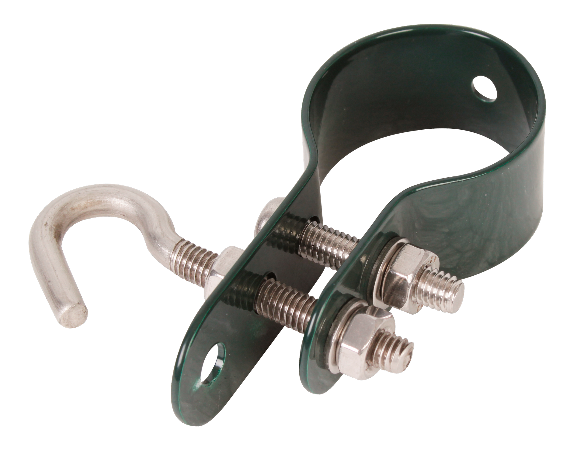 Schelle zur Befestigung von Geflechtspannstäben, Material: Stahl roh, Oberfläche: verzinkt, grün kunststoffbeschichtet, Schellen-#: 34 mm