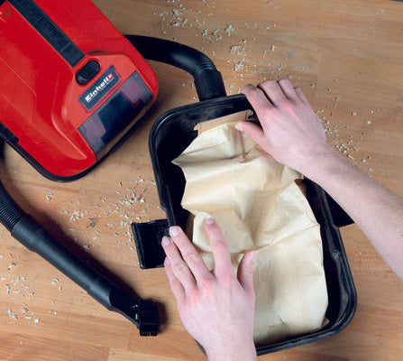 Das Einhell Schmutzfangsack-Set (10 L) ist ein praktisches Zubehör für Nass-Trockensauger. Im Set enthalten sind fünf Papierfilterbeutel, die jeweils ein Fassungsvermögen von 10 Litern haben. Ein Schmutzfangsack dient dem Aufsaugen von feinem und trockenem Schmutz, wodurch die Saugleistung länger erhalten bleibt. Die Saugerbeutel eignen sich nicht zum Aufsaugen von Flüssigkeiten. Die Schmutzfangsäcke können mit allen Einhell Nass-Trockensaugern mit 10 Liter großem Behälter verwendet werden, wie z. B. mit dem Akku-Nass-Trockensauger TE-VC 18/10 Li. Der Saugerbeutel wird in den Fangbehälter eingesetzt und der Saugstutzen wird mit der Öffnung des Saugerbeutels (Ø 38 mm) verbunden.