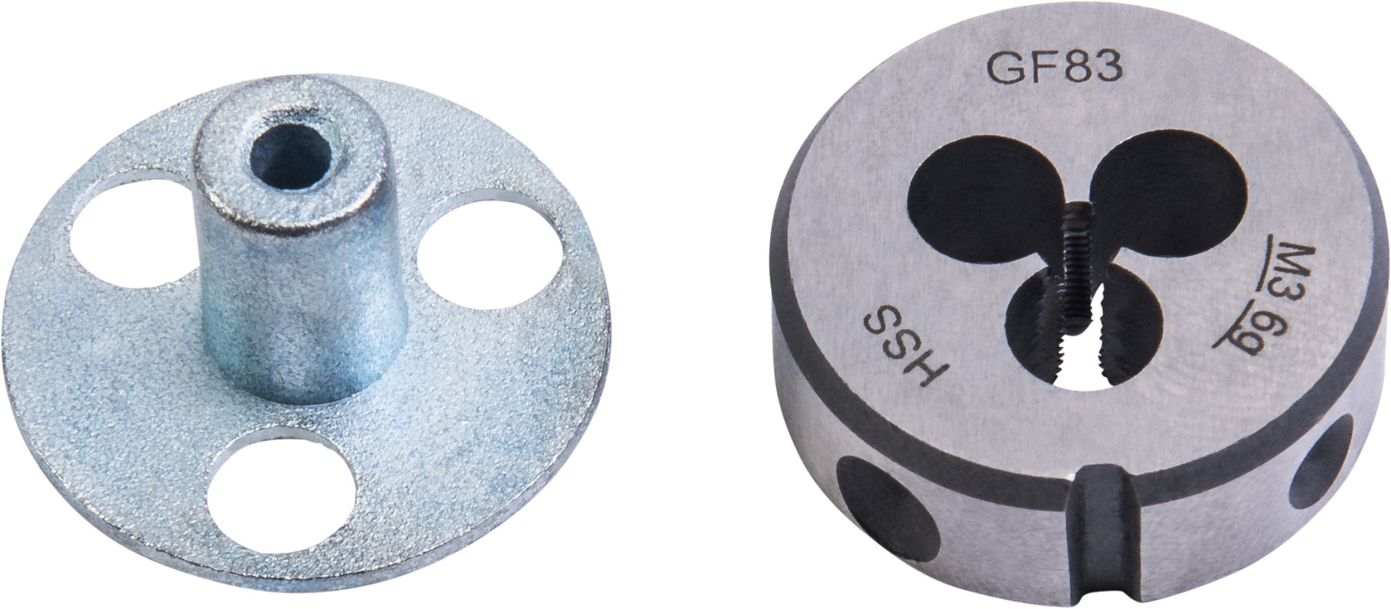HSS" Durchmesser 25 x 9 mm" Für metrisches ISO-Außengewinde" Inkl. Schneideisenführung aus Aluminium" Steigung: 0,5 mm