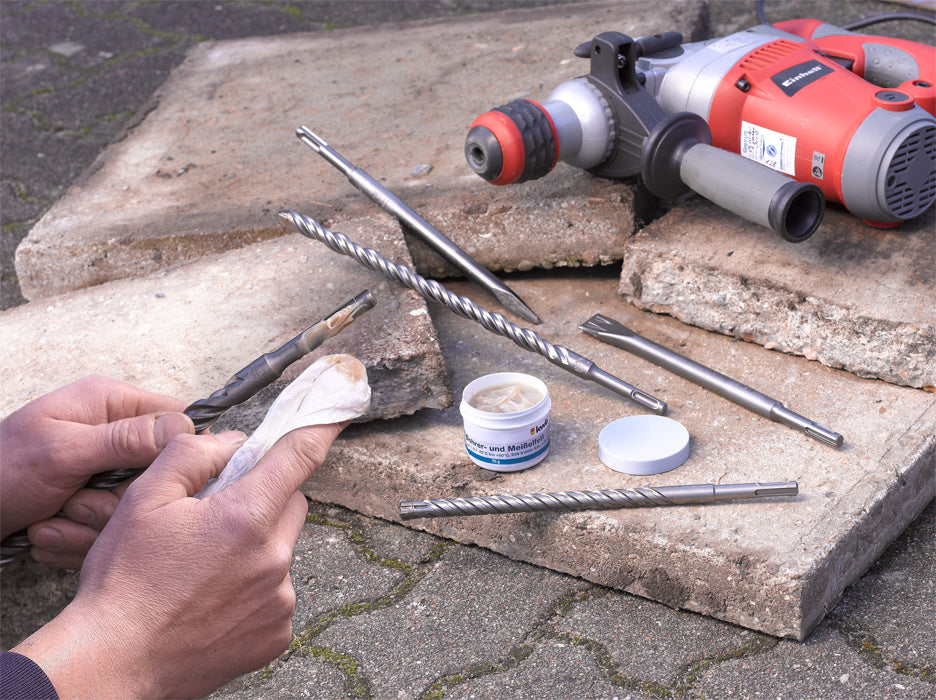 SDS Bohrer- und Meißelfett ist ein spezielles Schmiermittel, um den Verschleiß an Bohr- und Meißelhämmern zu minimieren. Vor jeder Bohr- oder Meißel-Arbeit den Schaft kurz in die 75g Dose mit dem Fett eintauchen, danach am Dosenrand abstreifen und in den Bohr- und Meißelhammer einspannen. Beim Arbeiten kontrollieren und beim trockenlaufen der Rille am Bohr- oder Meißel-Schaft erneut in die Fettdose eintauchen.