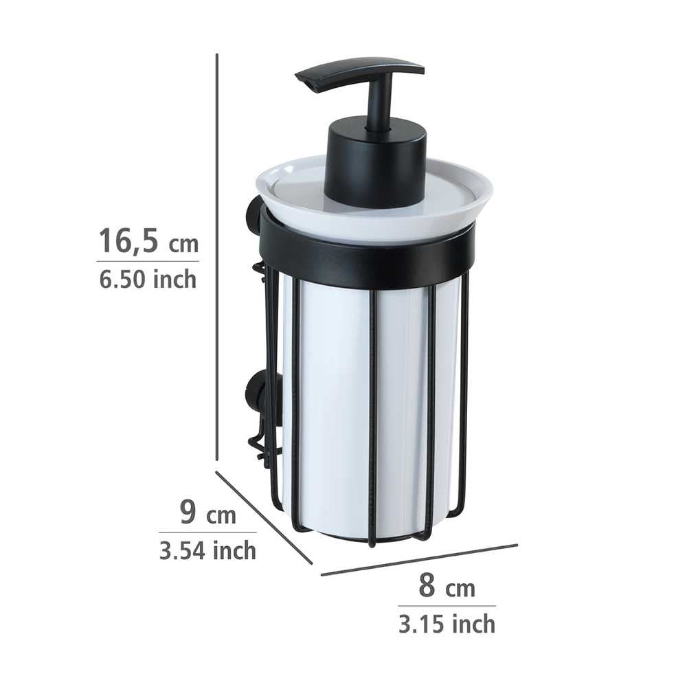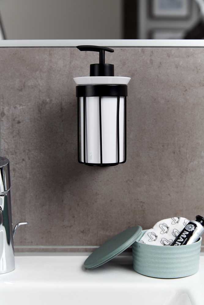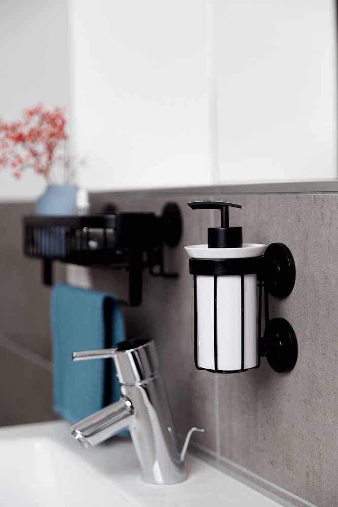 Die Bad-Accessoire Serie Classic Plus Black aus Stahl ist mit einer schwarzen Spezial-Beschichtung versehen, die hochwertigen Rostschutz bietet. Der nachfüllbare Pump-Seifenspender im Industrial Style hat ein Fassungsvermögen von ca. 185 ml. Durch leichten Druck auf den Dosierkopf wird die gewünschte Portion Flüssigseife abgegeben. Der abnehmbare, weiße Becher aus Kunststoff lässt sich leicht reinigen. Ideal für Küche und Bad. Im Lieferumfang sind Schrauben & Dübel enthalten. Alternativ bietet das System 3 weitere Befestigungsmöglichkeiten - ohne bohren - an. Separat erhältlich sind diese Adapter: Variante 1: Vacuum-Loc Adapter (Artnr.: 23891100) Das Vakuum-Saugsystem ermöglicht schnelles, einfaches und sicheres Anbringen und starken Halt auf luftundurchlässigen, ebenen und leicht unebenen Oberflächen. Variante 2: Turbo-Loc Adapter (Artnr.: 23889100) Die Turbo-Loc Befestigung ist ein Spezial-Klebepadsystem mit extrem festem Halt auf allen glatten Oberflächen. Variante 3: Power-Loc Adapter (Artnr.: 23890100) Das Power-Loc Kammer-Klebesystem zeichnet sich durch extrem festen Halt auf allen tragfähigen Oberflächen, z.B. Fliesen, Naturstein, Glas, Beton, Metall, Holz und vielen Kunststoffen aus. Das System hält auf rauem und leicht unebenem Untergrund. Für eine Variante ohne bohren , bestellen Sie separat den entsprechenden Adapter. Oder nutzen Sie das beiliegende Befestigungsmaterial.