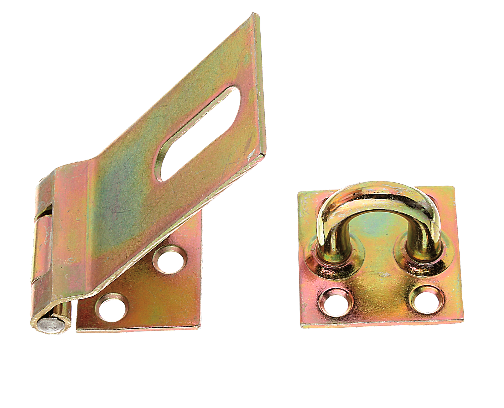 Sicherheits-Überfalle, mit versenkten Schraublöchern, Material: Stahl roh, Oberfläche: galvanisch gelb verzinkt, Länge Überfalle: 85 mm, Breite: 37 mm, Länge Anschraubplatte: 38 mm, Abstand Mitte Langloch - Mitte Stift: 62,5 mm, Vorhängeschloss-#: 12 mm, Materialstärke: 2,00 mm, Anzahl Löcher: 1 / 3 / 4, Loch: 10 x 32 / #6 / #5,4 mm