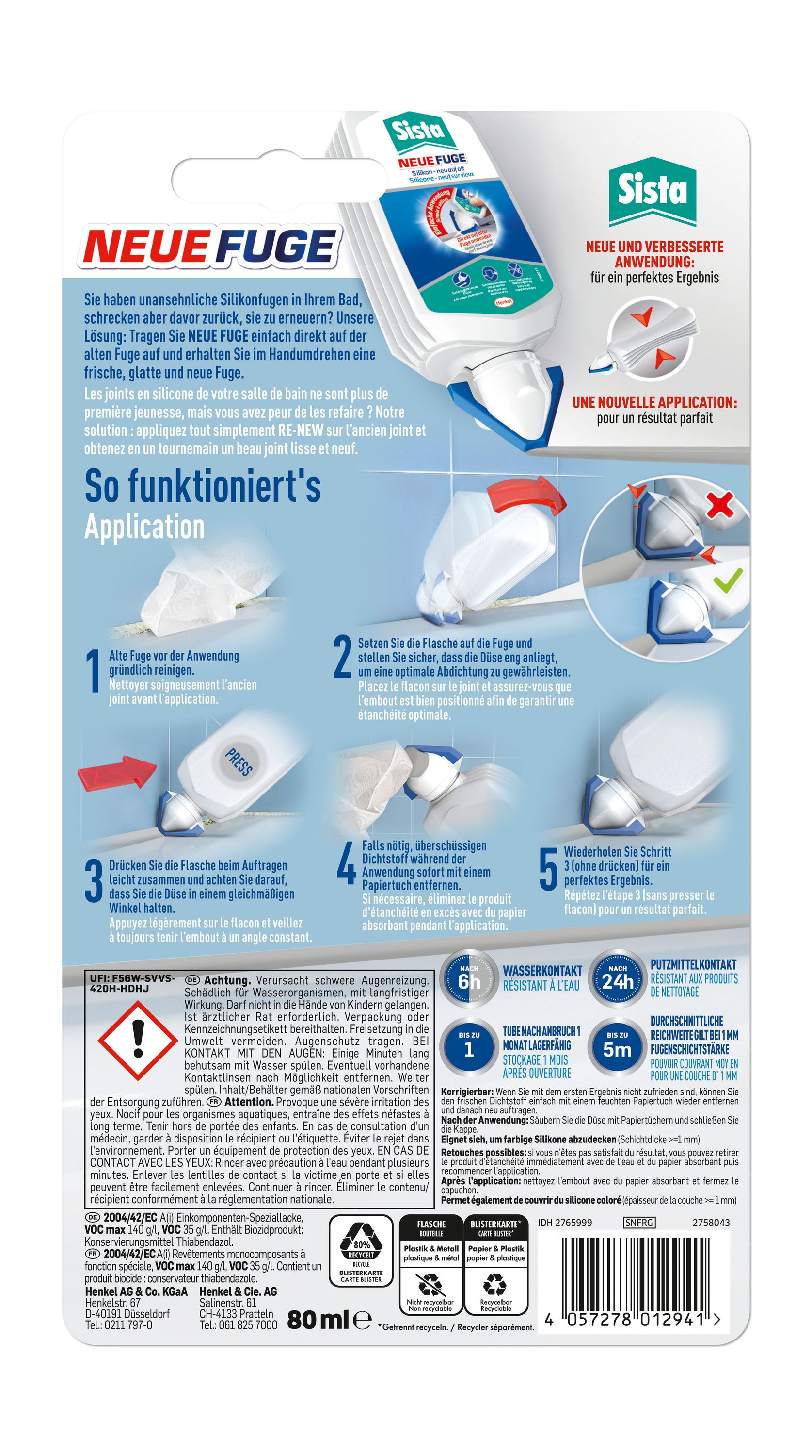 Sie haben unansehnliche Silikonfugen in Ihrem Bad, aber der Gedanke an aufwendiges Entfernen und Erneuern schreckt Sie ab? Mit Sista Neue Fuge (80ml) in Grau gehört das der Vergangenheit an! Dieses innovative Produkt ermöglicht es Ihnen, Ihre Fugen ganz einfach aufzufrischen: Tragen Sie es direkt auf der alten Fuge auf und erhalten Sie im Handumdrehen eine frische, glatte und neue Fuge.