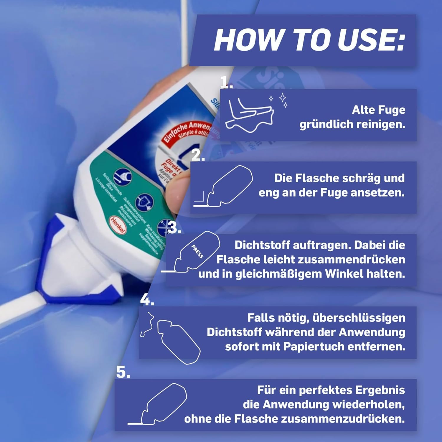 Eigenschaften: Auffrischung von Silikonfugen, einfache Anwendung, perfekte Farbabdeckung, exzellente Haftung, langzeit pilzhemmend, Komplettset.