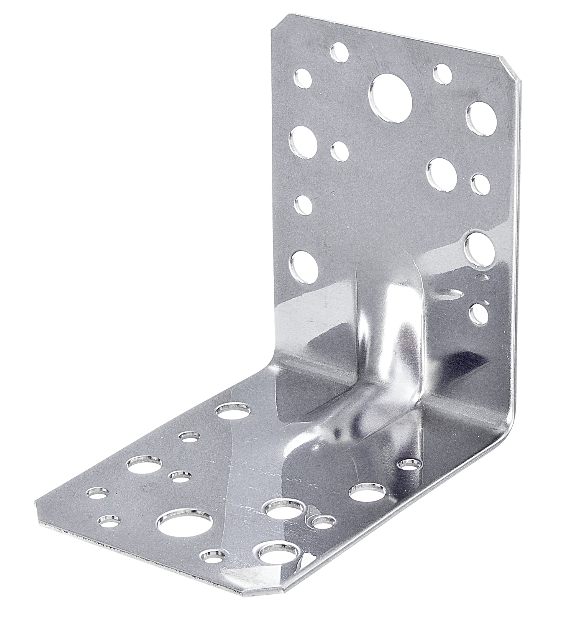 Schwerlast-Winkelverbinder mit Sicke, Material: Edelstahl, Tiefe: 90 mm, Höhe: 90 mm, Breite: 65 mm, Materialstärke: 2,00 mm, Anzahl Löcher: 2 / 10 / 14, Loch: #11 / #7,5 / #5 mm, CutCase