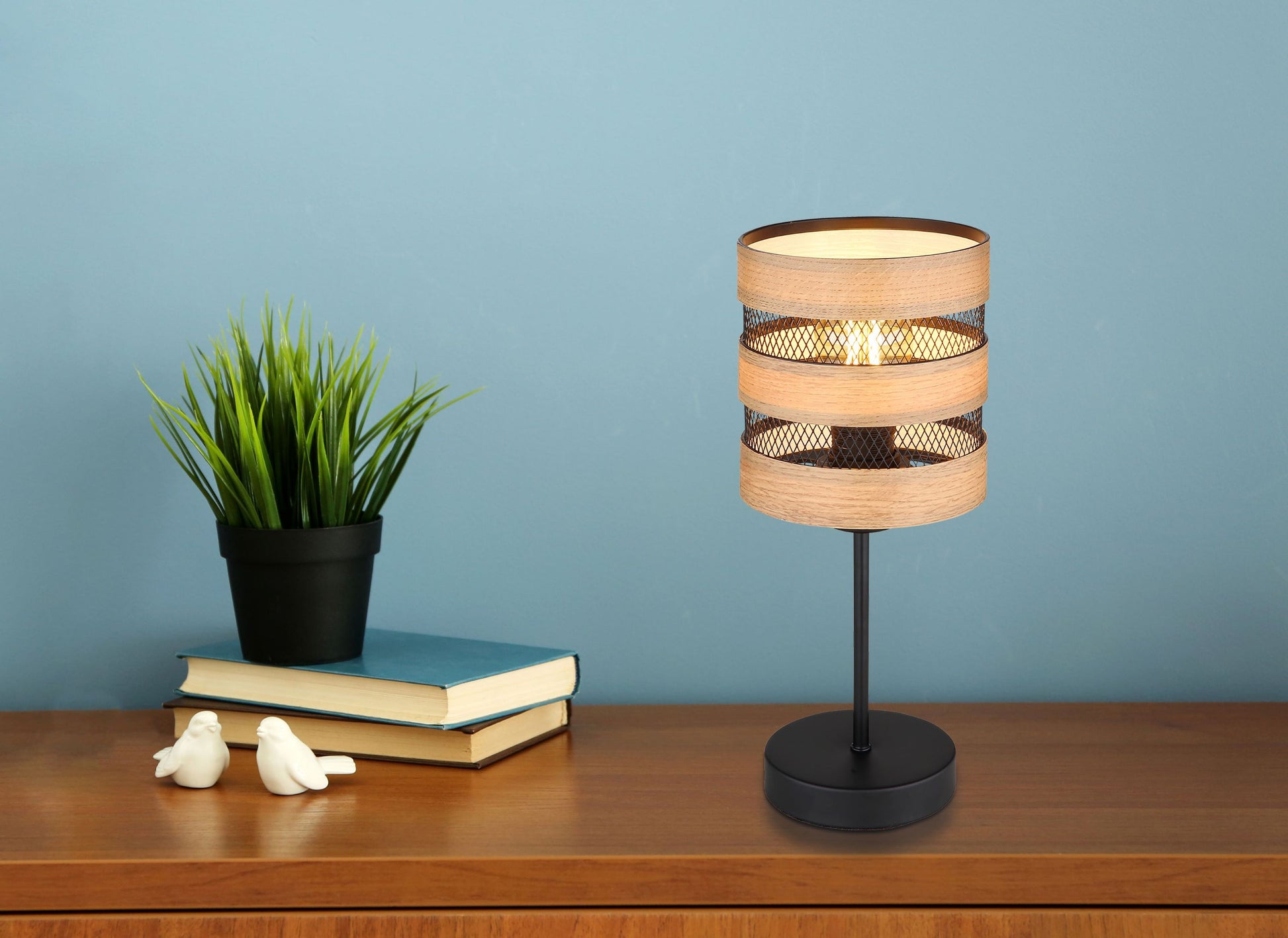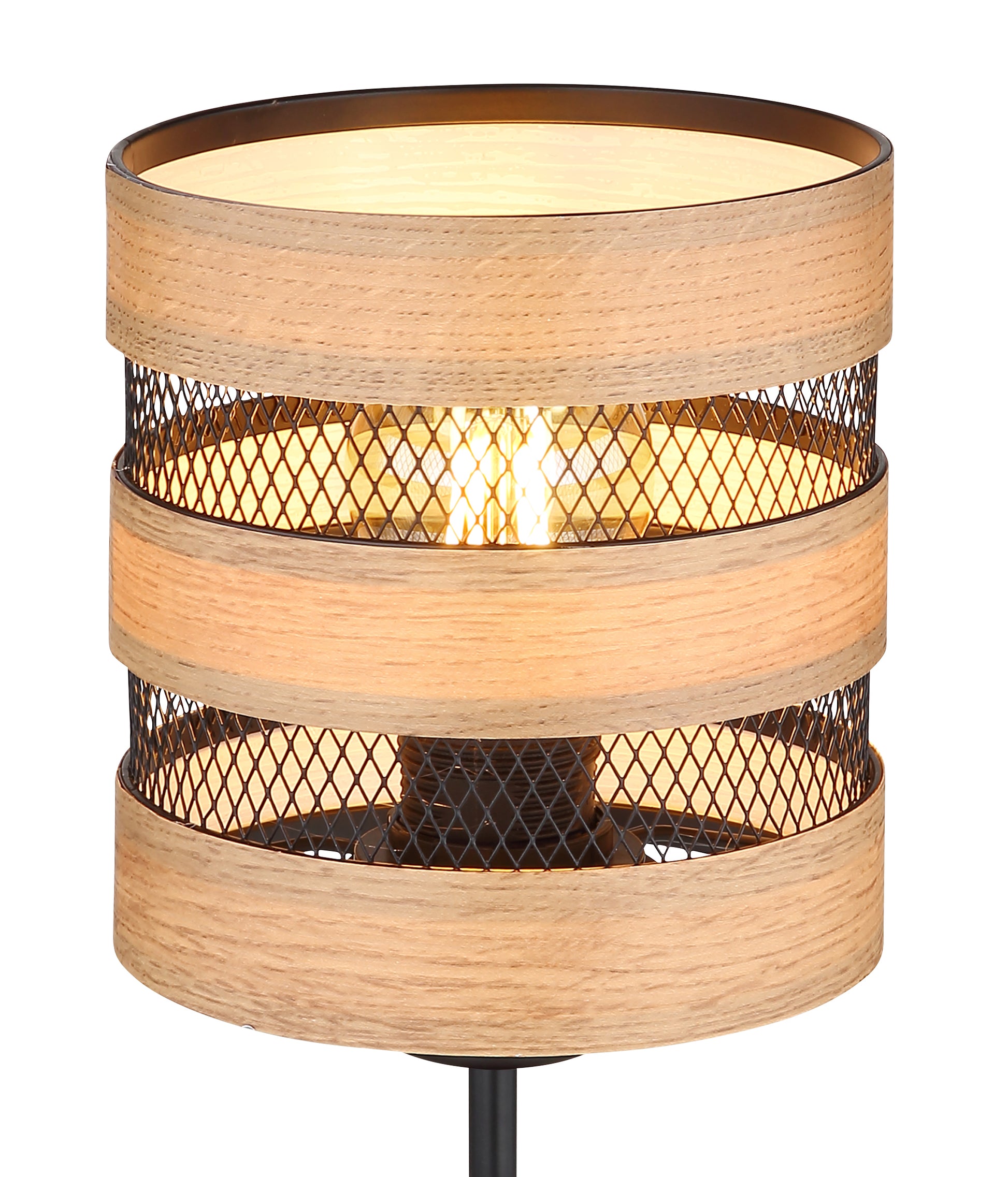 Diese tolle Tischleuchte begeistert durch Ihr schlichtes Design. Aus einem runden Sockel ragt eine schwarz runde Metallstange und mündet in einer Höhe von 33,5cm an einer E27 Fassung. Die E27 Fassung ist mit einem schönen Schirm aus Metallgittern und Verzierungen in Holzoptik bestückt. Sie ermöglicht Ihnen selbst, bis zu einer maximalen Leistung von 40 Watt, über Lichtfarbe und Helligkeit zu bestimmen.