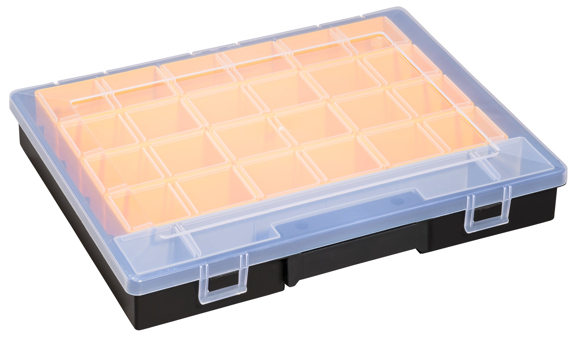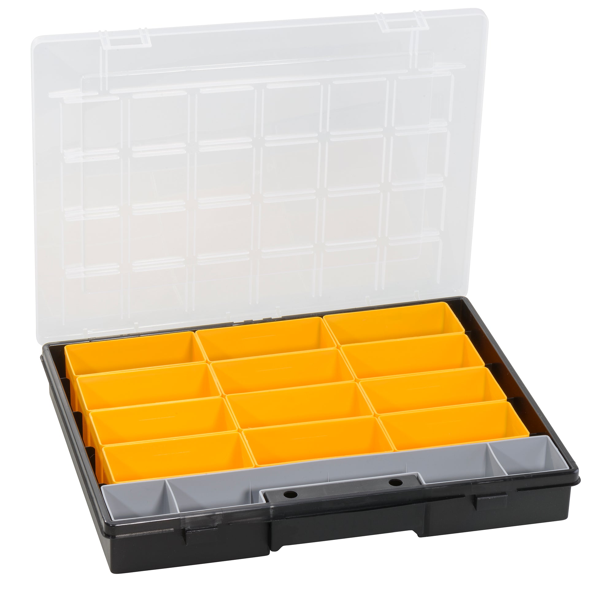 Transparenter Deckel mit Stabilen Schnappverschlüssen.Sichere Sortierung: herausnehmbare Einsatzboxen schließen fest mit transparentem Deckel ab.Ausgestattet mit zwei selbstklebenden Etiketten zur individuellen Beschriftung.Einsatz mit 3 Fächern für Schraubendreher, Zollstock etc..Passend zu EuroPlus Depot 37...