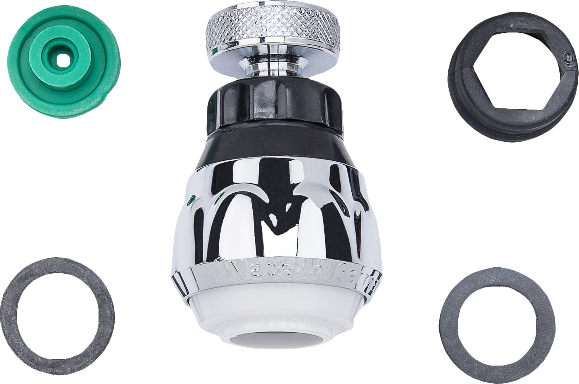 Kunststoff / Messing schwarz / verchromt" Mit Kugelgelenk aus Messing" Mit Gewinde-Übergangsstück aus Kunststoff M24 x 1 AG auf M22 x 1 AG" Umstellbar von Normal- auf Brausestrahl" Mengenregulierung reduziert die Durchflussmenge um bis zu 50 % auf ca. 7 l/min." Inkl. Dichtungen" Nicht geeignet für drucklose Geräte" M22 x 1 IG-AG