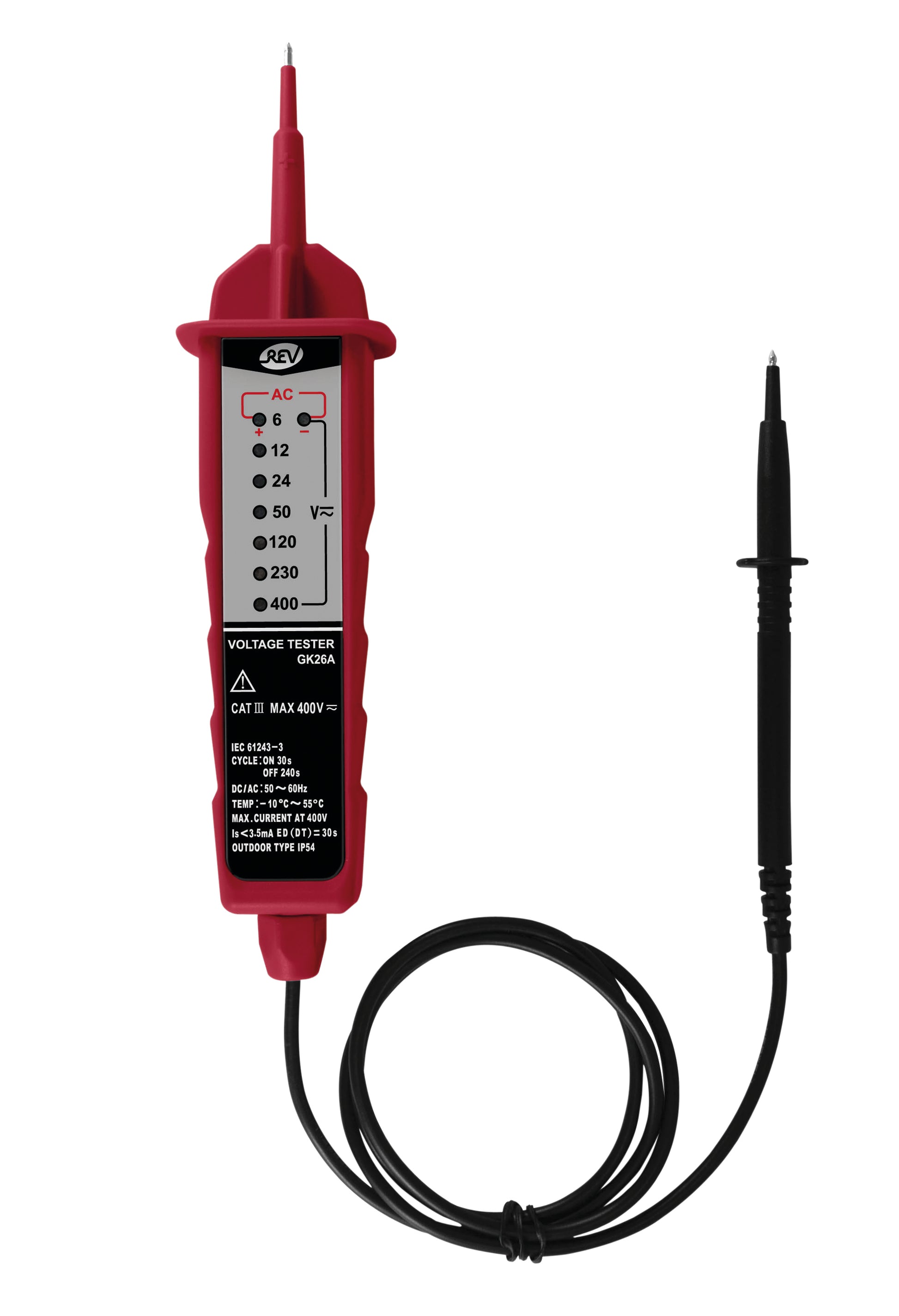 7-stufige LED-Anzeige Arbeitstemperatur: -10° C bis +55° C Schutzart: IP 54 Gefertigt und geprüft nach EN61243-3 Gleich- und Wechselspannung Polaritätsanzeige Spannungsprüfer: 6 - 400 V; 50 - 60 Hz Spannungsskala: 6 V, 12 V, 24 V, 50 V, 120 V, 230 V, 400 V Batterie: 2 x 1,5 V LR44 (enthalten)