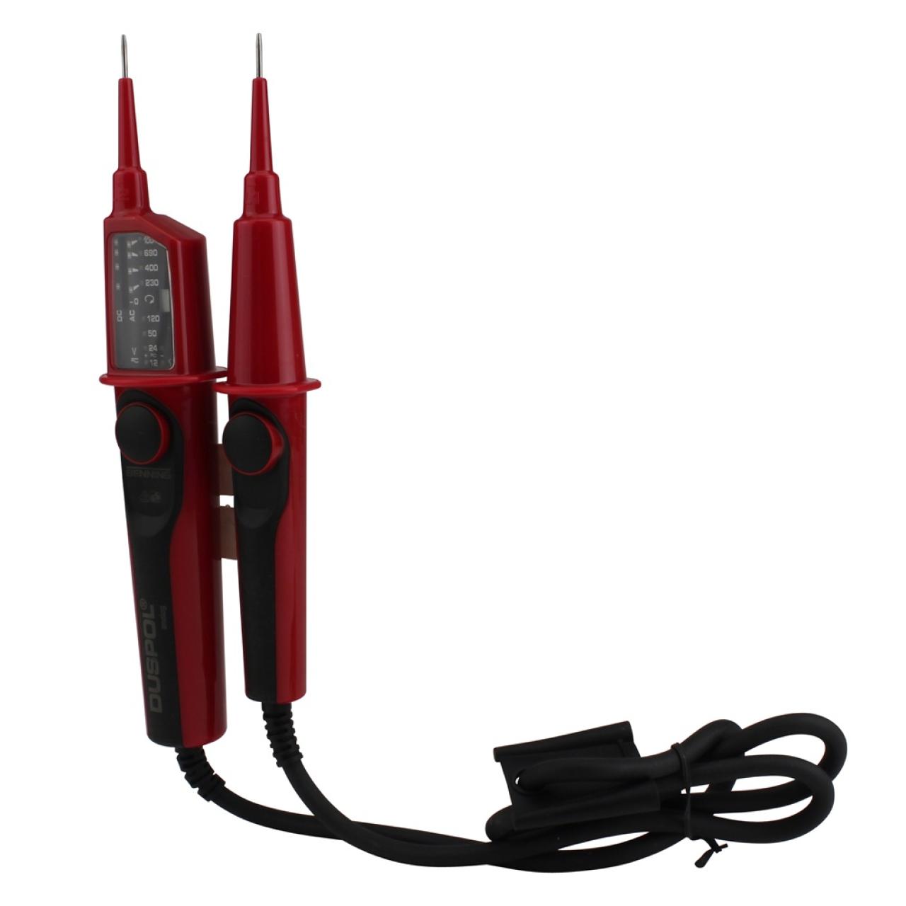 DUSPOL analog. Spannungsprüfer mit Tauchspul-Pegelanzeige. Geeignet für Elektrotechnik, Industrie, Instandhaltung, Service (Fehlersuche), Photovoltaik-/ Windkraftanlagen und Hybrid-Fahrzeugtechnik. Prüfart 2-polig. Spannungsanzeige LED. Spannungsmessbereich 12 V - 1000 V AC/DC. Anzeigestufen: 12, 24, 50, 120, 230, 400, 690, 1000 V AC/DC. Drehfeldrichtungsanzeige ja, LCD. Polaritätsanzeige ja, LED. Einpolige Phasenanzeige ja, rote LED. Direktanzeige ohne Drucktasterbetätigung, hochohmige Prüfung. Lastzuschaltung über Drucktaster, niederohmige Prüfung. Bewusste Auslösung des RCD/FI-Schutzschalters. Vibrationsalarm im Prüfgriff. Interne Grundlast ja. Last zuschaltbar ja. Verwendbar bei Niederschlägen ja, Schutzart IP 65 staubdicht, strahlwassergeschützt. Robuste Gehäuseausführung mit gummierter Grifffläche. Geprüft und zugelassen nach DIN EN 61243-3, VDE 0682-401:2015. Messkreiskategorie Cat IV. Max. Spannung Messkreiskategorie 600 V. Messkreiskategorie Cat III. Max. Spannung Messkreiskategorie 1000 V. Länge 260 mm. Klingenlänge 15 mm. Klingenbreite 2 mm. Stromversorgung vom Prüfobjekt (ohne Batterie). Inklusive Messspitzenschutz.