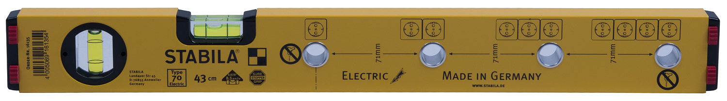 Angenehm leichtes Aluminium-Rechteckprofil mit Markierlöchern für Elektroinstallationsarbeiten" Integrierte Markierlöcher in genormten Abständen zum Einmessen und Anzeichnen der Lochabstände von Schaltern und Steckdosen in einem Arbeitsgang (71 mm, nach DIN 49075)" Das umständliche Hantieren mit mehreren Messwerkzeugen entfällt" Endkappen mit Rutschstopper fester Sitz der Wasserwaage beim Anzeichnen" Kunststoff-Endkappen schützen das Profil bei Schlägen" Beschichtete Messfläche schont empfindliche Oberflächen" Einfach zu reinigen dank der glatten Seitenflächen und der elektrostatischen Pulverbeschichtung" STABILA Einbautechnologie sorgt für Langzeitpräzision Messgenauigkeit in Normalposition ± 0,5 mm/mAusstattung: 1 Horizontal-Libelle, 1 Vertikal-Libelle, 1 beschichtete Messfläche, Markierlöcher
