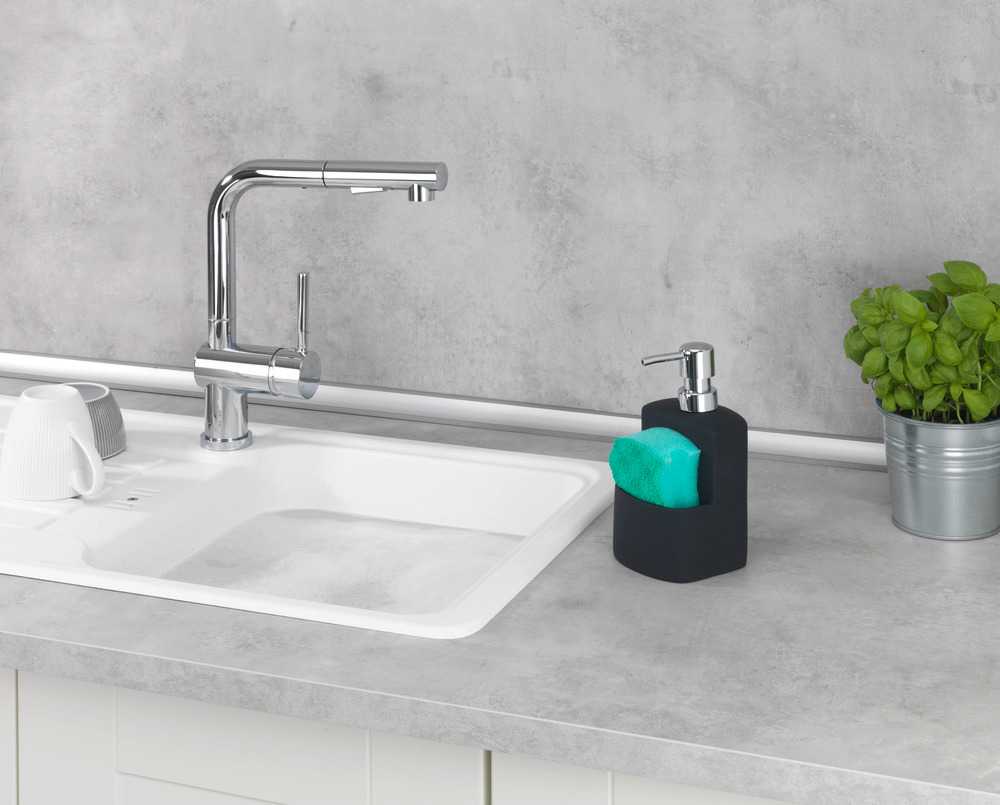 Der hochwertige Spülmittelspender Festival setzt dezente Akzente im klassischen Schwarz. Die hochglanzverchromte Kunststoffpumpe kombiniert mit der griffigen, gummierten Keramik (SOFT-TOUCH Keramik) sorgt für ein exklusives Ambiente in jeder Küche. Der dekorative Seifenspender kann individuell mit bis zu ca. 380 ml Spülmittel oder Flüssigseife gefüllt werden. Durch leichten Druck auf den Dosierknopf wird die gewünschte Menge Spülmittel herausgepumpt. Praktisch ist die integrierte Aufbewahrungsmöglichkeit für einen Spülschwamm.