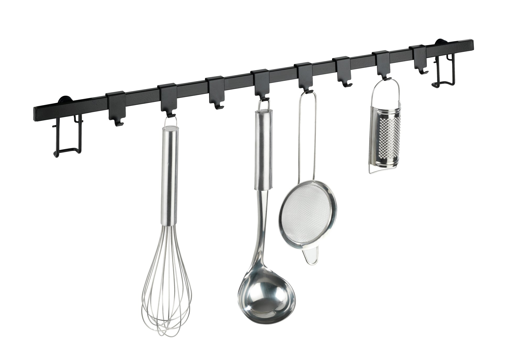 Mit der angesagten Küchen-Serie Gala machen Sie die Küche zu einem wahren Wohlfühlort! Die hochwertigen Accessoires sind aus pulverbeschichtetem Flachstahl gefertigt und im trendigen Schwarz gehalten. So zieht der lässige Fabrik-Charme auch in Ihre Küche, denn Einrichtung im Industrial Style ist nicht nur für Lofts geeignet. Die originelle Haken-Leiste Gala lässt sich über der Arbeitsfläche in der Küche anbringen, so dass alle Kochutensilien schnell griffbereit sind. Die funktionale Aufhängung schafft zusätzlichen Raum in der Küche und bietet eine geordnete Übersicht beim Kochen oder Backen. Einfach die Küchenhelfer wie Schneebesen, Suppenkelle, Pfannenwender, Schere, etc. an den acht beiliegenden Haken aufhängen, schon schaffen Sie Ordnung und zusätzlichen Stauraum auf 60 cm Breite. Die Küchen-Reling lässt sich genau dort befestigen, wo sie gerade benötigt wird. Im Lieferumfang sind Schrauben und Dübel für die Wandmontage enthalten. Sie möchten lieber Befestigen ohne bohren? Kein Problem! Alternativ bietet WENKO zusätzlich eine weitere Befestigungsmöglichkeiten - ohne bohren - an. Separat erhältlich sind diese passenden Adapter: Turbo-Loc® Adapter Schwarz (Artikelnummer: 54835100) Die Turbo-Loc® Wandbefestigung ist ein Klebesystem mit extrem festem Halt auf allen glatten Oberflächen. Einfach die Schutzfolie der beiden Klebepads entfernen, die Halterung an der gewünschten Stelle fixieren und anpressen. Upgrade für Ihre Küche: Mit den weiteren Küchen-Accessoires der Gala-Serie wie dem Küchenrollenhalter, Universalregal und Gewürzregal verleihen Sie Ihrem Lieblingsort einen einheitlichen, topaktuellen Look.