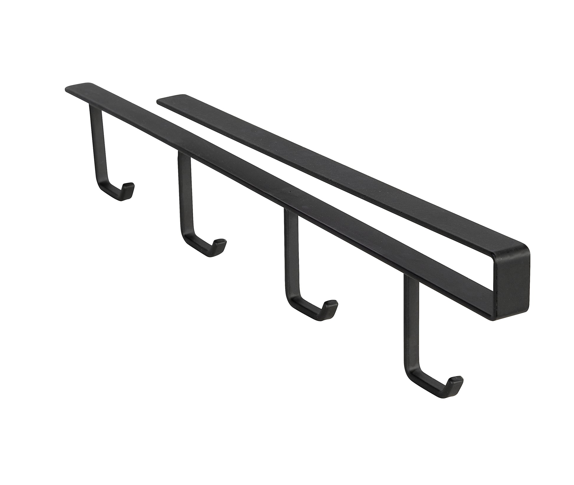 Wenn der Platz in der Küche knapp bemessen ist, ist der dekorative, schwarze Tassenhalter eine praktische Alternative, um möglichst viele Tassen platzsparend und ordentlich im Schrank oder unter dem Regal unterzubringen. Bei Bedarf kann der Halter mit einem Griff wieder entnommen werden. Die sauber gespülten Tassen werden einfach am Henkel in den praktischen Tassenhalter gehängt. So werden bis zu 4 Tassen stets sicher und vor Staub geschützt aufbewahrt. Das lästige Bohren in Schränken oder an Regalen entfällt, da der Schrankeinbau einfach über das Regalbrett gestülpt wird. Schon hängen die Tassen sicher und gerade. Die Aufhängung ist rutschsicher, aus stabilem Metall gefertigt und für eine Regalbodenstärke von ca. 2 cm geeignet.