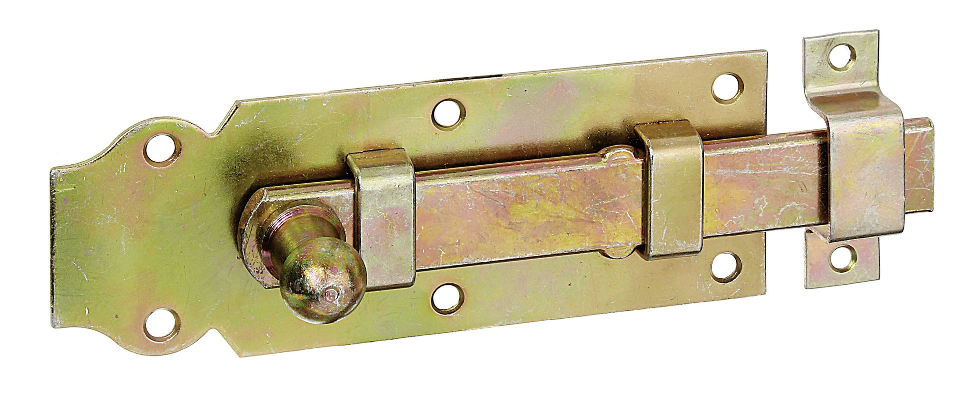 Türriegel mit Knopfgriff, mit versenkten Schraublöchern, Material: Stahl roh, Oberfläche: galvanisch gelb verzinkt, Ausführung: gerade, mit befestigter Schlaufe, Plattenlänge: 140 mm, Plattenbreite: 52 mm, Schieberbreite: 20 mm, Schließblechbreite: 16 mm, Schließblechlänge: 55 mm, Anzahl Löcher: 6 / 2, Loch: #5 / #4,5 mm