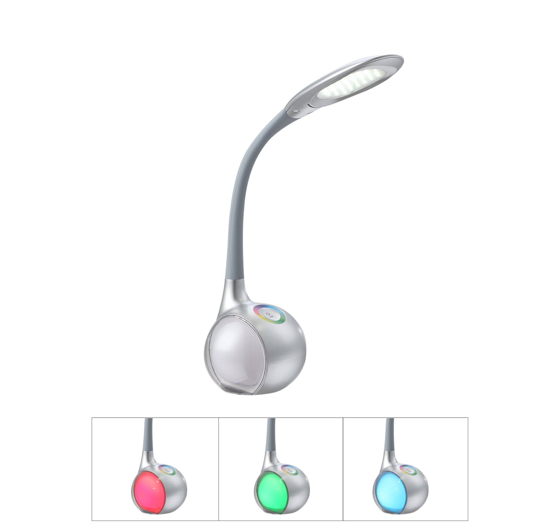 Die stylische Tischlampe Tarron (max. 53cm), überwiegend hergestellt aus silbergrauem Kunststoff überzeug durch Design und Funktionalität. Das inkludierte LED Leuchtmittel dieser dimmbaren Tischleuchte leistet maximal 280 Lumen starkes und 5500 Kelvin kaltweißes Licht. Das im Sockel eingebaute RGB Leuchtmittel lässt diese Schreibtischlampe bunt erstrahlen. Farbe und Lichtstärke kann mit dem verfügbaren Touchdimmer verstellt und fixiert werden.