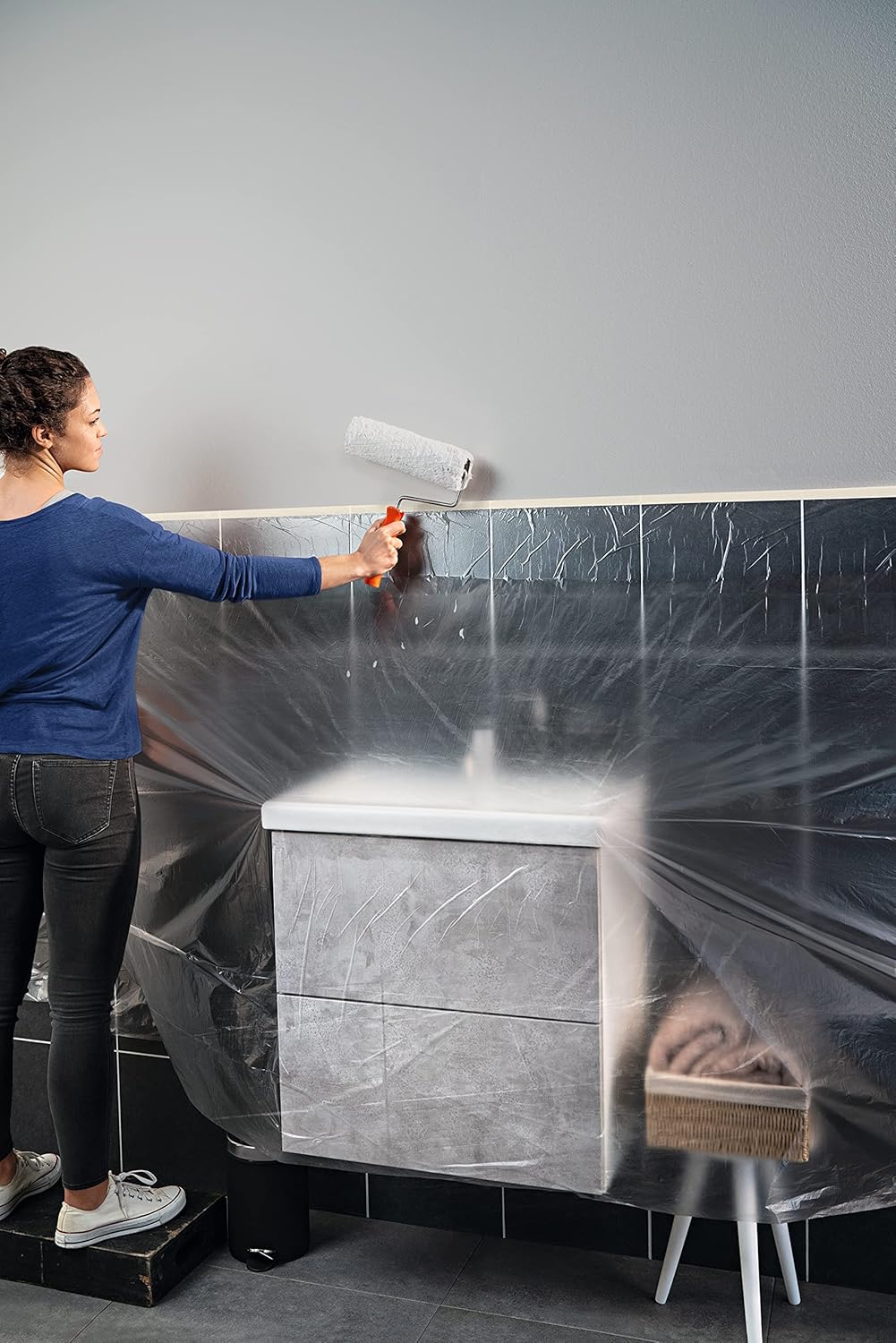Einfache Abdeckarbeiten: Du rollst das Band aus, klebst es entlang der gewünschten Kante fest und ziehst dann die Abdeckfolie über die zu schützende Fläche. Schneller geht's kaum!