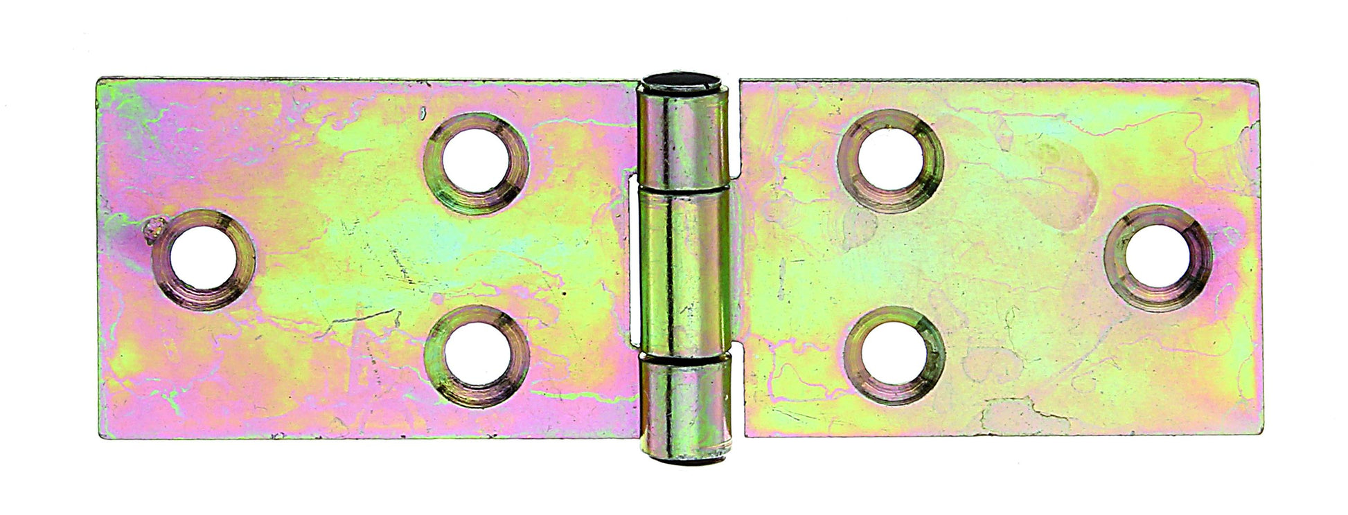 Tischband, mit vernietetem Edelstahlstift, mit versenkten Schraublöchern, Material: Stahl roh, Oberfläche: galvanisch gelb verzinkt, Länge: 26 mm, Breite: 81 mm, Ausführung: gerollt, Materialstärke: 1,30 mm, Anzahl Löcher: 6, Loch: #4,5 mm