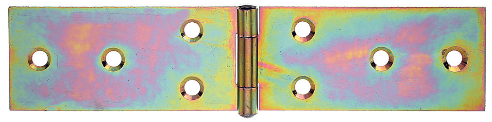 Tischband, mit vernietetem Edelstahlstift, mit versenkten Schraublöchern, Material: Stahl roh, Oberfläche: galvanisch gelb verzinkt, Länge: 40 mm, Breite: 181 mm, Ausführung: gerollt, Materialstärke: 1,50 mm, Anzahl Löcher: 8, Loch: #6 mm