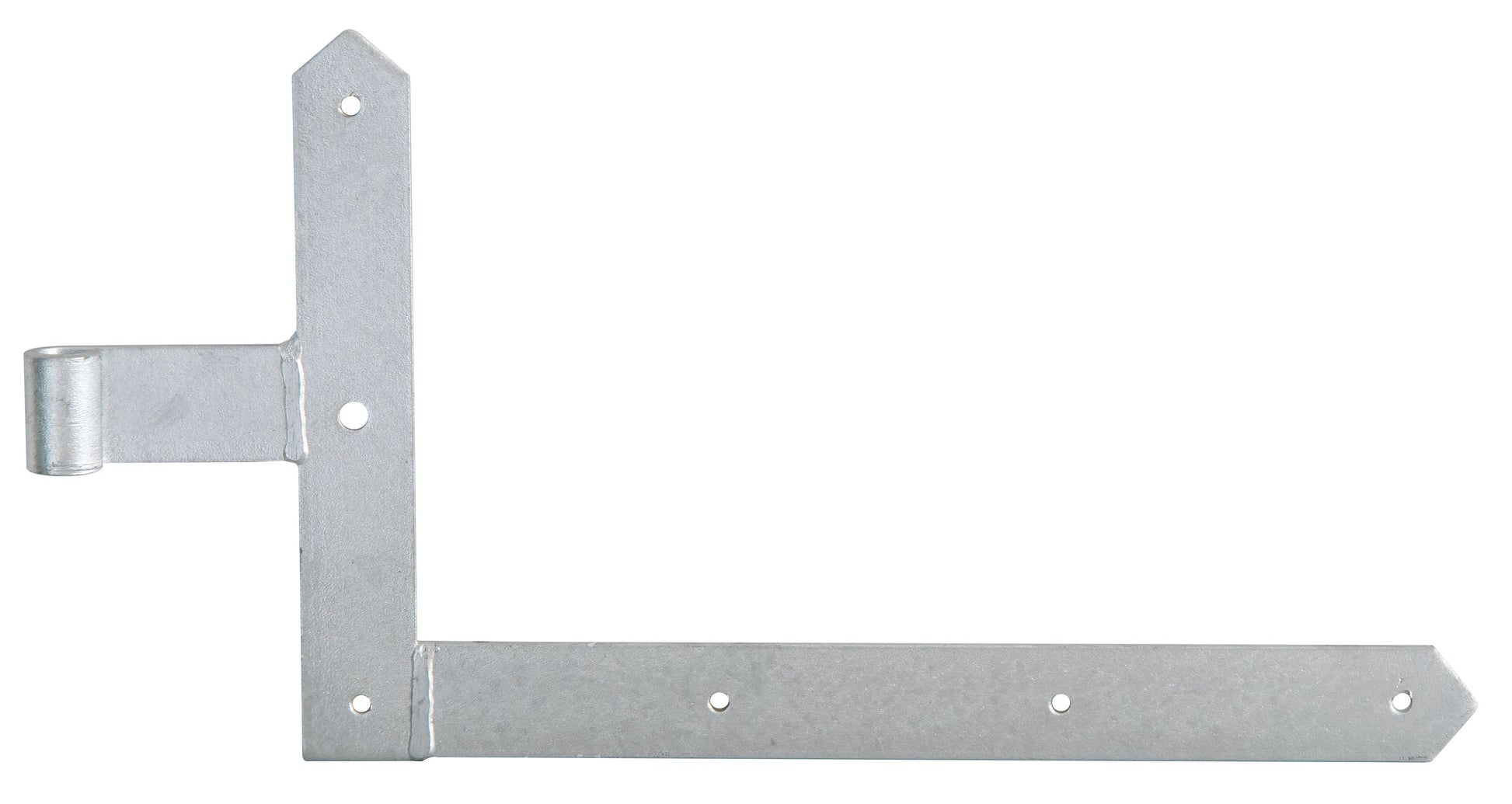 Tor-Winkelband, gerade, Abschluss spitz, für Rahmentore, Material: Stahl roh, Oberfläche: feuerverzinkt, Höhe: 250 mm, Länge: 400 mm, Rollen-#: 13 mm, Breite: 40 mm, Abstand Mitte Band - Mitte Rolle: 100 mm, Artikelbeschreibung: unten, Materialstärke: 5,00 mm, Anzahl Löcher: 5 / 1, Loch: #7 / #10 mm