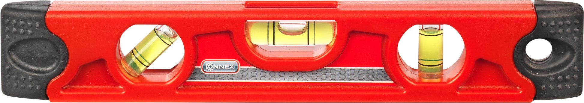 Drei Libellen (horizontal, vertikal, 45°)" 2% Gefälle auf der horizontalen Libelle ablesbar" Magnetstreifen" Gummiendkappen