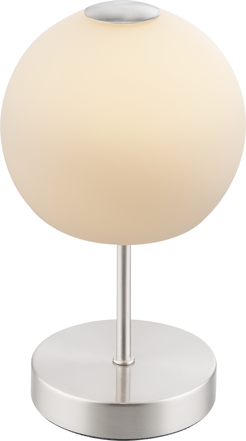 Die kugelförmige Tischlampe Trude besteht aus einem nickel matten Metallsockel, sowie einer opalen Glaskugel (Ø15 cm). Diese 27,5 cm große Tischlampe spendet ein 400 Lumen starkes Licht mit einer angenehmen 3000K Lichtfarbe. Ein- und ausgeschaltet wird mit einer Touchfunktion.