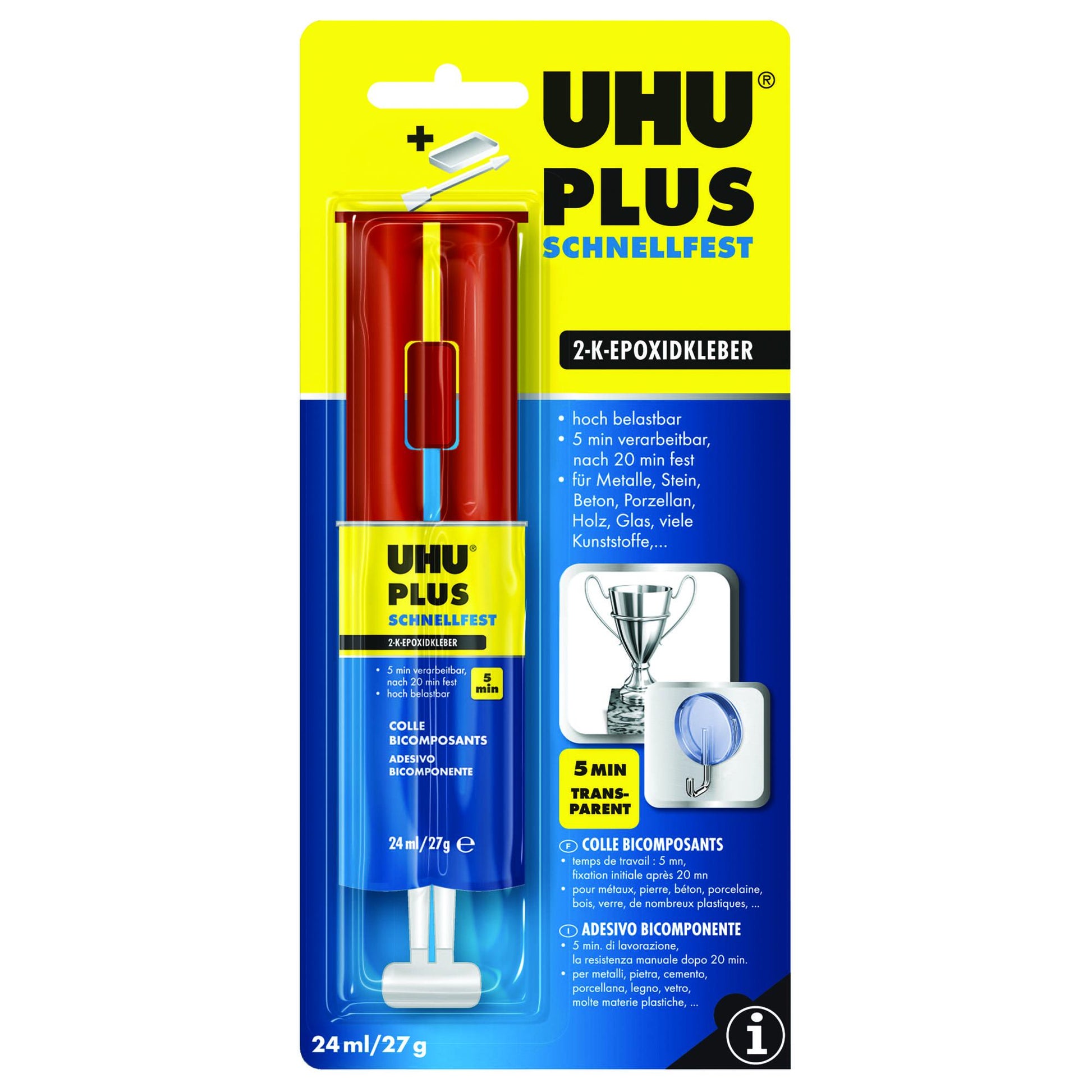 Zweikomponenten-Klebstoff auf Epoxidharzbasis für schnelle, belastbare Klebungen. In der Doppelkammer-Spritze. Die anwendungsfreundliche Doppelkammer-Spritze erlaubt eine automatische Ausbringung der 2 Komponenten im richtigen Mischverhältnis. Ermöglicht hochfeste Klebeverbindungen an nahezu allen festen Werkstoffen. Die Verarbeitungszeit beträgt bis zu 5 Minuten, Handfestigkeit wird nach 20 Minuten erreicht. Die Endfestigkeit liegt bei ca. 1300 N/cm². Die Klebeverbindung härtet transparent aus, ist schlagfest, alterungs- und feuchtigkeitsbeständig.