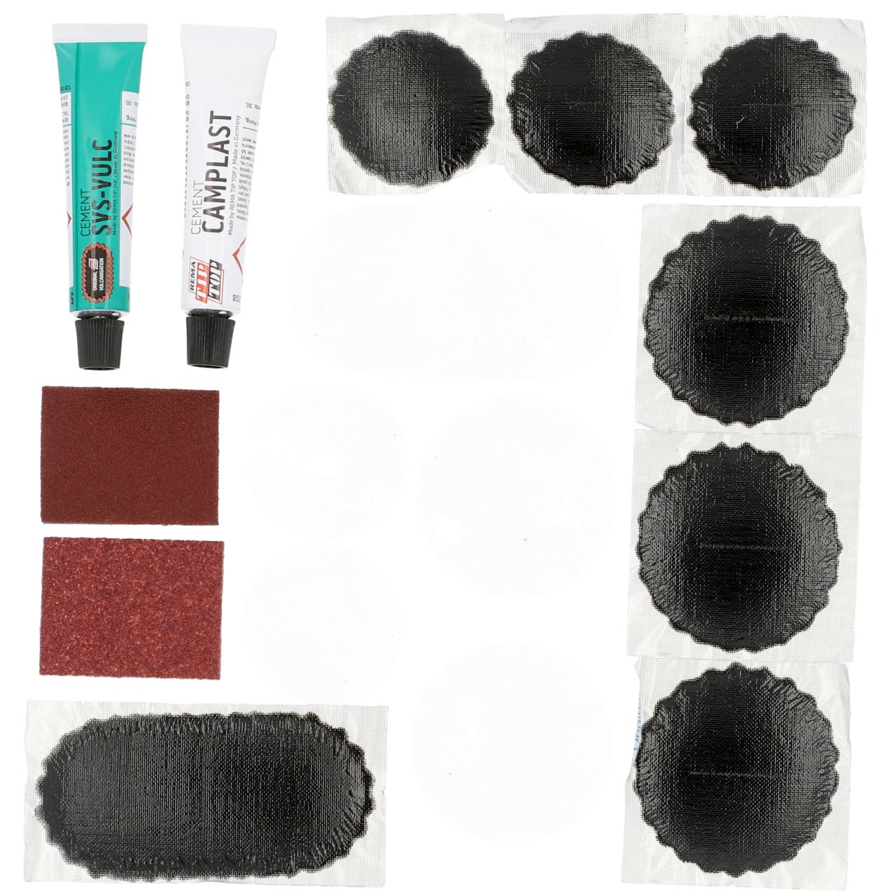 Für Artikel aus Weich-PVC, Gewebe oder mit Gewebeoberfläche, und Kunstleder. " Bestehend aus: " 1 ovaler Flicken Plastik " 2 runde Flicken Plastik groß " 2 runde Flicken Plastik klein " 1 PVC-Kleber " für Artikel aus Gummi bestehend aus: " 1 ovaler Flicken " 3 runde Flicken groß " 3 runde Flicken klein " 1 Tube Vulkanisierlösung " 2 Aufrauher