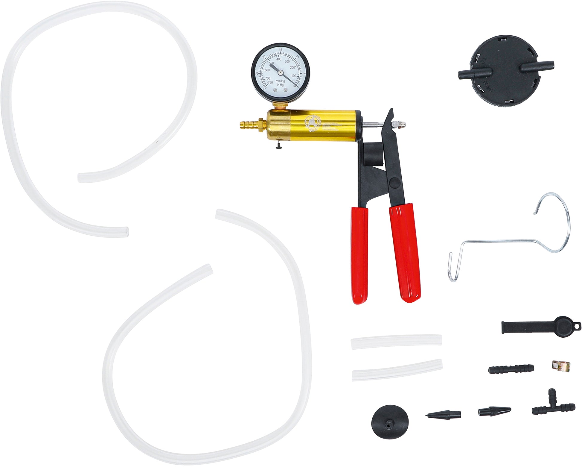 Zwei-in-Eins-Funktion: Das Gerät dient primär als Bremsenentlüfter, indem es Unterdruck erzeugt, um die Bremsflüssigkeit anzusaugen und so Luft aus dem System zu entfernen. Gleichzeitig kann es auch als Vakuumpumpe zur Prüfung von verschiedenen vakuumbetriebenen Komponenten im Fahrzeug eingesetzt werden.
