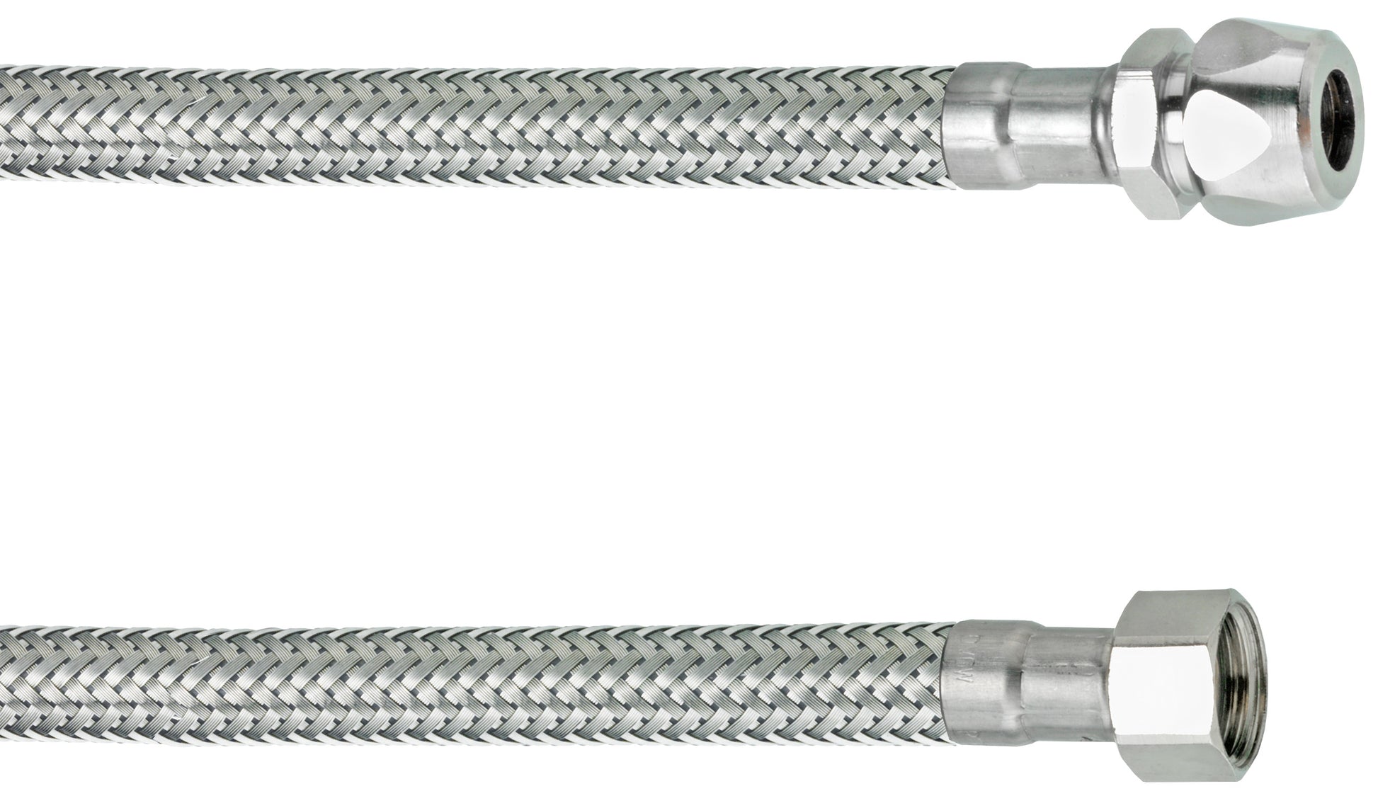 Edelstahl-Umflechtung" Betriebsdruck: max. 10 bar" Betriebstemperatur: max. + 90° C" Eine Seite Verschraubung Innengewinde" Eine Seite Quetschverschraubung" Inkl. Dichtung" 3/8" IG, ø 8 mm, Länge: 1000 mm