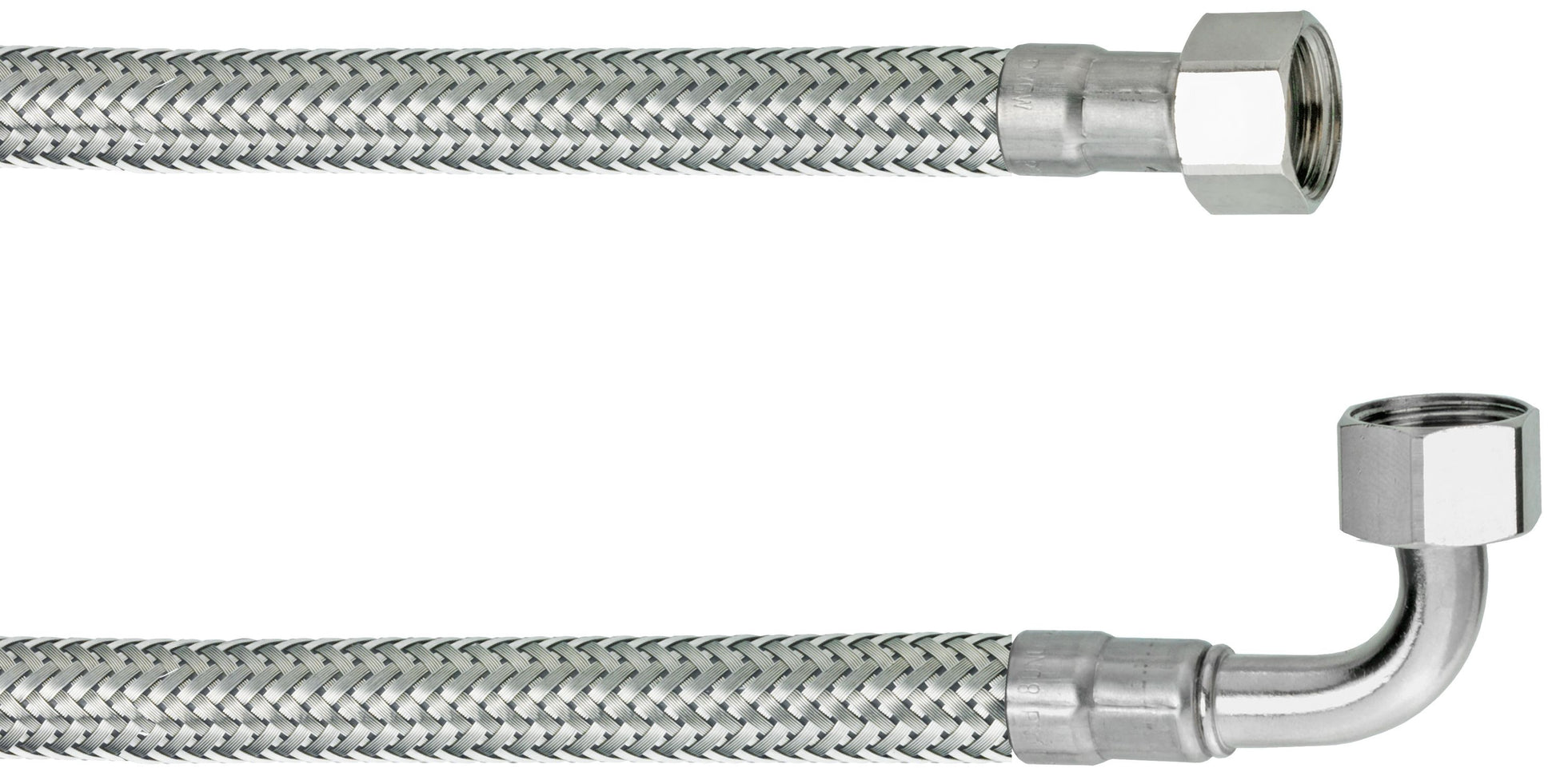 Edelstahl-Umflechtung" Betriebsdruck: 10 bar" Betriebstemperatur: max. + 90° C" Eine Seite gerade Verschraubung Innengewinde" Eine Seite Winkelverschraubung Innengewinde" 3/8" IG, 3/8" IG, Länge: 200 mm