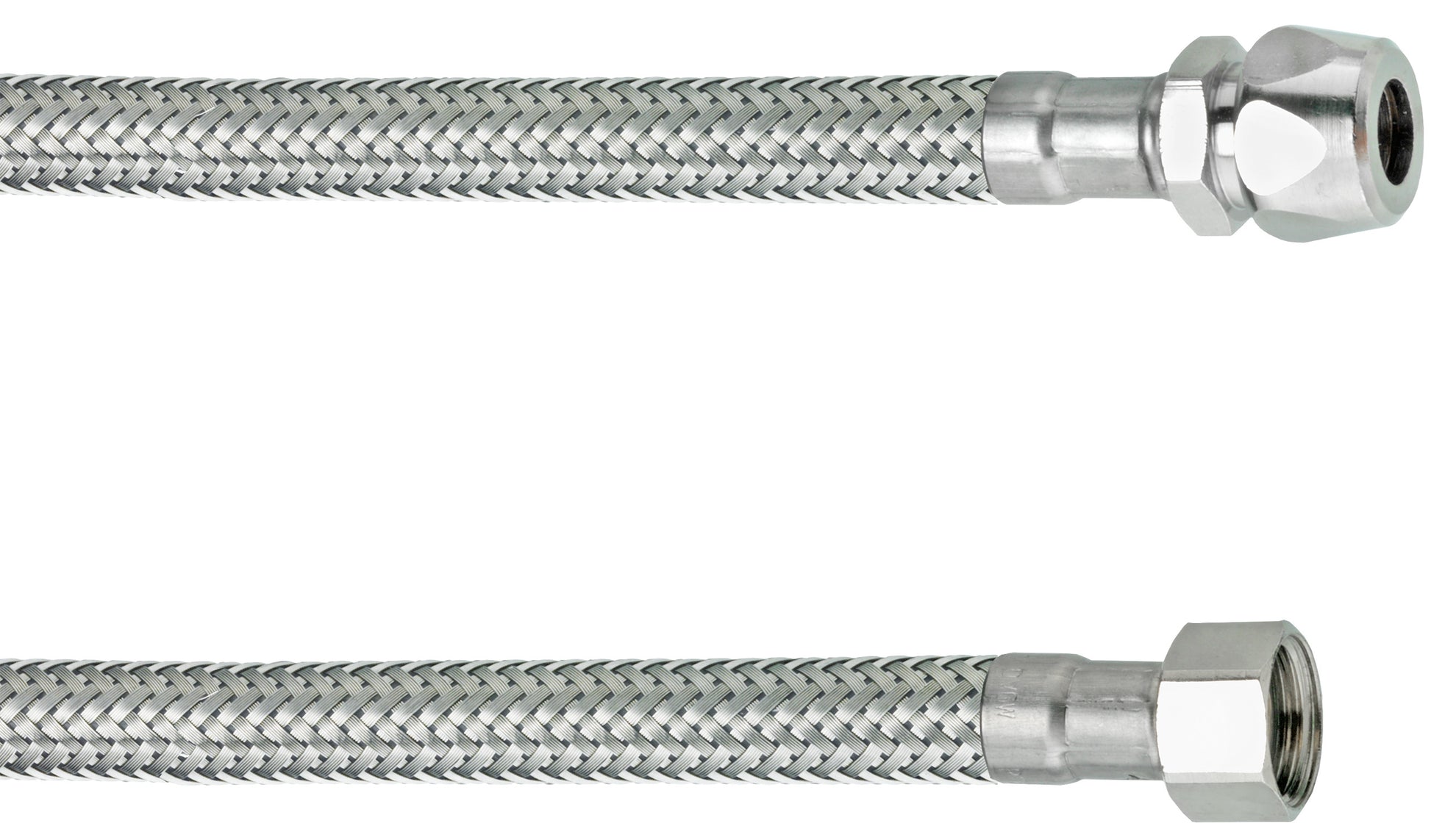 Edelstahl-Umflechtung" Betriebsdruck: max. 10 bar" Betriebstemperatur: max. + 90° C" Eine Seite Verschraubung Innengewinde" Eine Seite Quetschverschraubung" Inkl. Dichtung" 3/8" IG, ø 8 mm, Länge: 500 mm