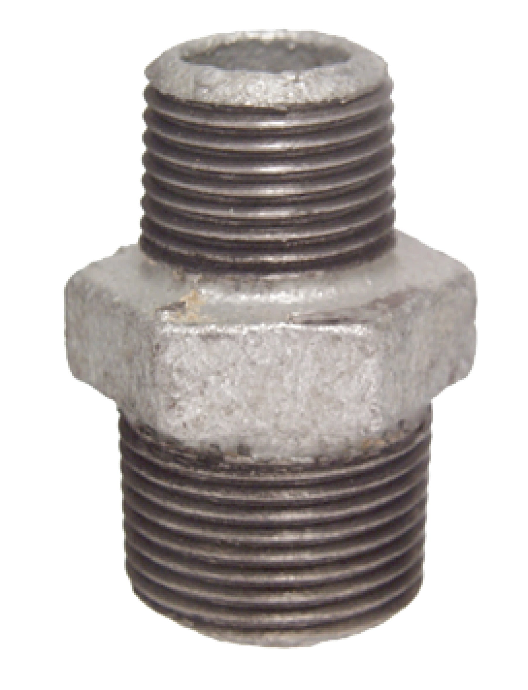 Temperguss" Verzinkt" Reduziert" Mit 2 Außengewinden" Nach DIN EN 10242 Design-Symbol A gefertigt" Konisches Gewinde nach DIN EN 10226-1 (ISO 7-1) metallisch dichtend" 1 1/2" AG, 1 1/4" AG