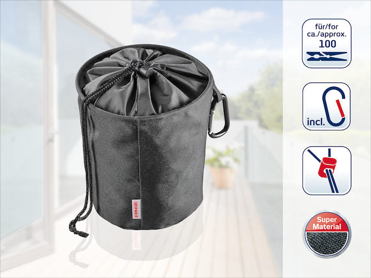 Wer den Wäscheklammerbeutel im Leifheit Online-Shop kauft, der kann seine Klammern sauber verstauen und hat sie immer direkt griffbereit. Denn an dem Beutel befindet sich ein Karabinerhaken, mit dem er einfach an der Wäscheleine befestigt werden kann. So sind die Klammern beim Aufhängen der Wäsche stets parat. Da der Klammerbeutel aus hochwertigem, engmaschig gewebtem Stoff besteht, sind die Wäscheklammern vor Umwelteinwirkungen wie Regen und Korrosion geschützt. Der Boden ist wasserdurchlässig, sodass kein Wasser im Beutel stehen kann. Über eine Zugkordel wird der Wäscheklammerbeutel schnell und einfach verschlossen. So schützt er seinen Inhalt vor Staub und Schmutz. Mit seinem besonders großen Füllvolumen bietet er Platz für bis zu 100 Klammern.