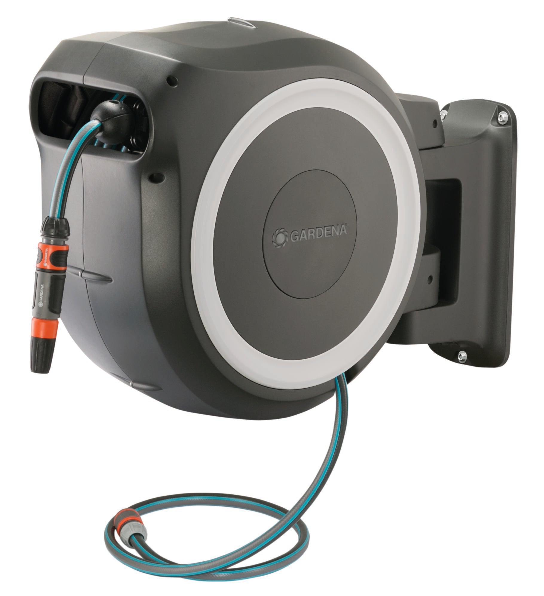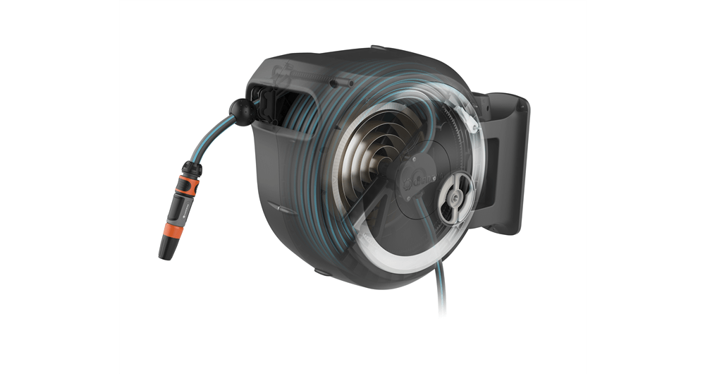 Nach dem Herausziehen des Schlauchs arretieren besonders kurze Stops den Schlauch automatisch, wenn du stehen bleibst. Ein leichtes Ziehen am Schlauchende löst die Arretierung aus, und eine integrierte Stahlfeder zieht den Schlauch vollautomatisch, sicher und kontrolliert ein.