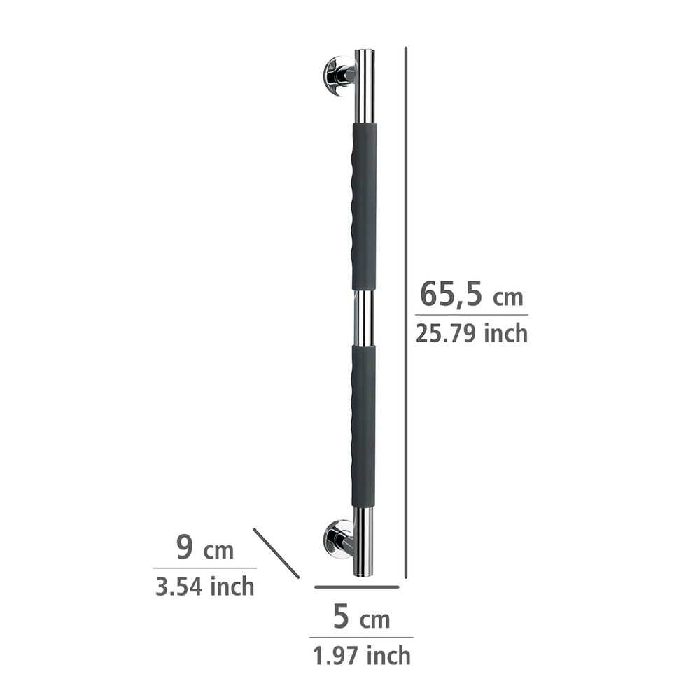 Die Secura-Produkte von WENKO erleichtern den Alltag und geben auch bewegungseingeschränkten Menschen die Möglichkeit, die täglichen Herausforderungen bei der Körperhygiene eigenständig zu bewältigen. Bedacht auf Sicherheit und Komfort – entdecken Sie unser breit gefächertes Secura-Sortiment. Unsere Badgriffe sind ideal als Gleichgewichtsstütze beim Duschen, Baden oder am WC und verleihen in jeder Situation einen festen Halt. Probleme beim Aufstehen und Hinsetzen gehören der Vergangenheit an: Der 65,5 cm lange Wandhaltegriff Secura lässt sich an der Badezimmerwand frei wählbar platzieren. Mit dem zuverlässigen Bad-Sicherheitsgriff von WENKO kommt man ganz einfach und ohne fremde Hilfe in die Badewanne hinein und wieder heraus. Auch neben dem WC macht sich der komfortable Wandhaltegriff stets nützlich. Der Haltegriff kann mit maximal 120 kg belastet werden. Der TÜV Bauart geprüfte Haltegriff ist aus schwerem, hochwertigem Edelstahl gefertigt kombiniert mit ergonomischen Soft-Touch-Griffflächen in angesagtem Schwarz. Im Lieferumfang sind Schrauben und Dübel zur Befestigung enthalten.