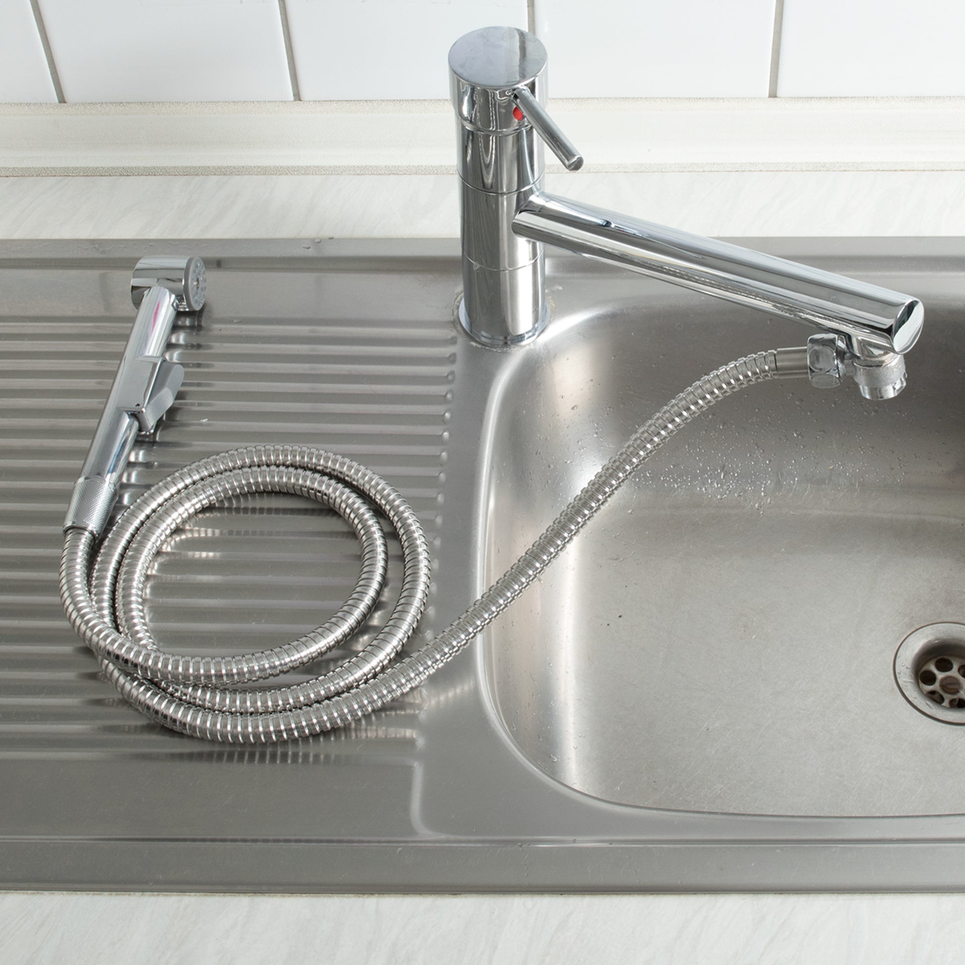 Waschbecken Brause-Set Der praktische Problemlöser mit vielen Einsatzmöglichkeiten im Haushalt, Bestehend aus: Handbrause ½ (Normalstrahl), Wandhalter, Armaturenanschluss inkl. Universaladapter für Innen- (M24) und Außengewinde (M22), Metall-Brauseschlauch ½ x 1,25 m, Inkl. Montagezubehör, Verchromt, Funktion: Praktisches Umstellen zwischen Armatur und Waschbecken-Handbrause durch Drucktaste, Wird der Umsteller an der Brause losgelassen, fließt das Wasser wieder direkt aus der Armatur, Passend an allen handelsüblichen Armaturen mit Luftsprudler M22x1 oder M24x1, Für Durchlauferhitzer geeignet (nicht für Niederdruck-Armaturen geeignet), Einfache Montage. / Änderungen vorbehalten Durchflussmenge: 3,50 l/min bei 3bar