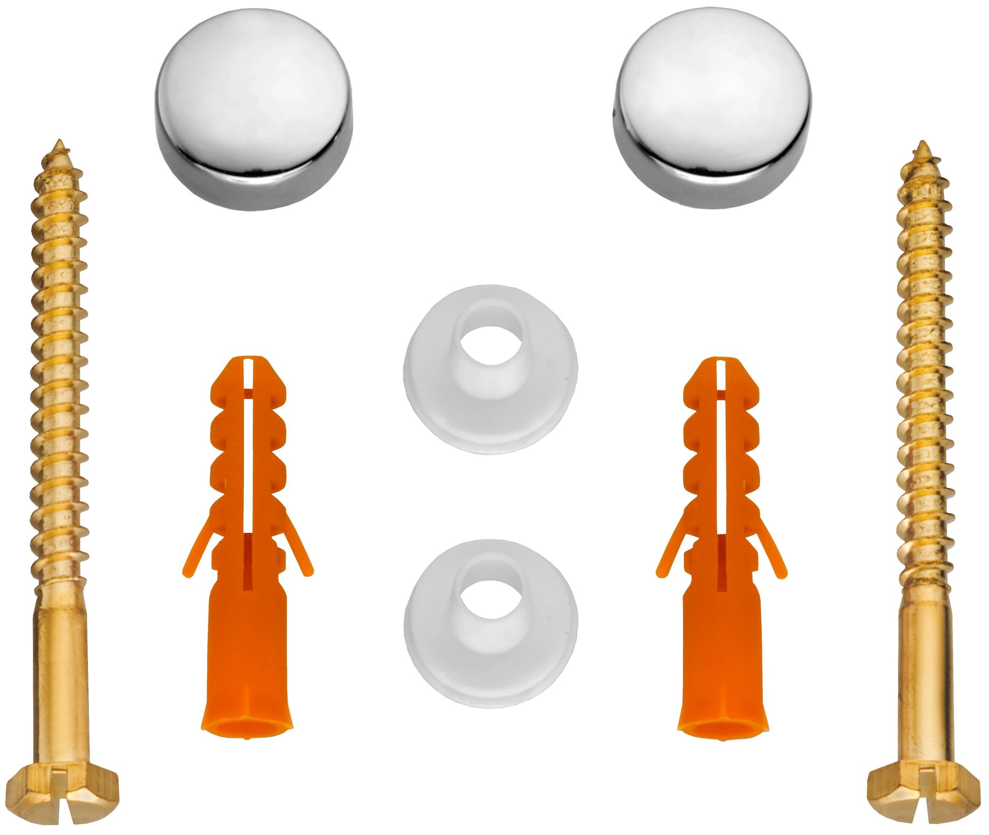 Kunststoff / Messing, verchromt" Bestehend aus:" 2 Messing-Sechskantschrauben 6 x 70 mm" 2 Dübel ø 8 mm" 2 Kunststoffscheiben" 2 Zierkappen" 6 x 70 mm
