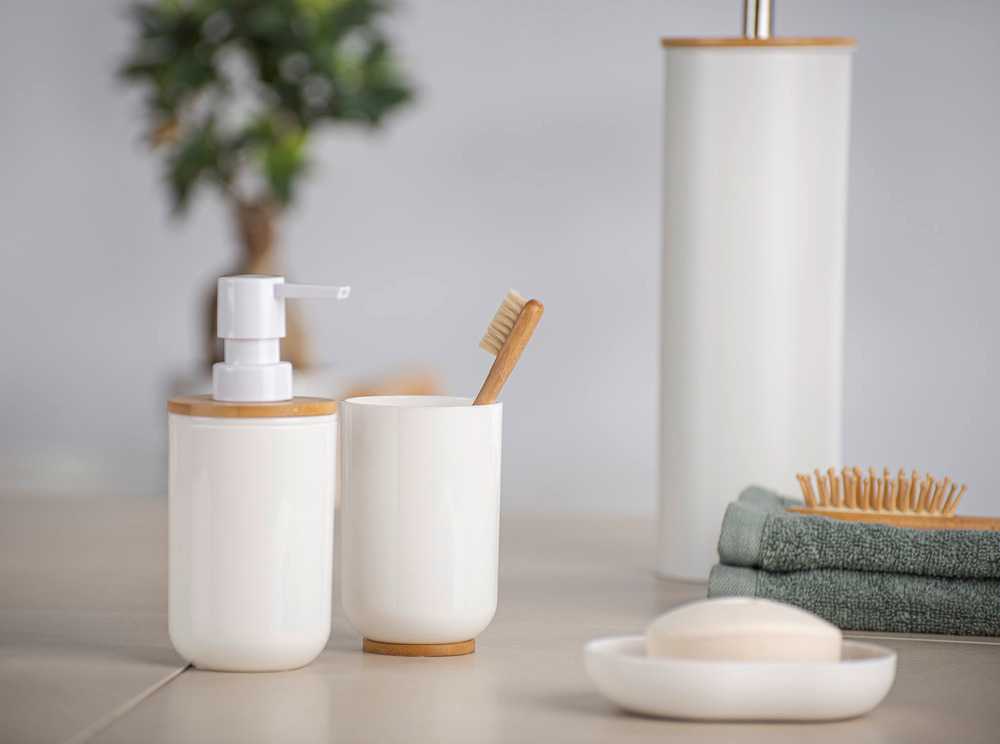 Die Bad-Serie Posa aus hochwertigem Kunststoff, kombiniert mit Bambus, ist ein optisches Highlight in jedem Badezimmer und Gäste-WC. Durch die WC-Garnitur in schlichtem Weiß und dem darauf abgestimmten Bambusdeckel schaffen Sie ein natürliches Ambiente in Ihrem Bad. Mit der WC-Garnitur Posa wird das Badezimmer nicht nur optisch aufgewertet, sondern sie ist zudem auch immer an gewünschter Stelle griffbereit. Durch ihre geschlossene Form dringen weder Gerüche nach außen noch ist die WC-Bürste direkt sichtbar. Die dazugehörige WC-Bürste hat einen auswechselbaren, schwarzen Bürstenkopf von Ø 7,5 cm. Mit dieser praktischen WC-Bürste kann das WC gründlich gereinigt werden. Die Bürste gewährleistet durch ihre strapazier- und anpassungsfähigen Borsten eine zuverlässige Nutzung. Die Accessoires der Serie Posa sind frei von Bisphenol A, einer chemischen Verbindung, die der Gesundheit schaden kann. BPA freie Produkte stärken zudem das Bewusstsein für Nachhaltigkeit, denn sie schonen unsere Umwelt. Ergänzend zu der schönen WC-Garnitur bietet WENKO auch die passende Seifenschale und den passenden Seifenspender und Zahnputzbecher der Posa-Serie an.