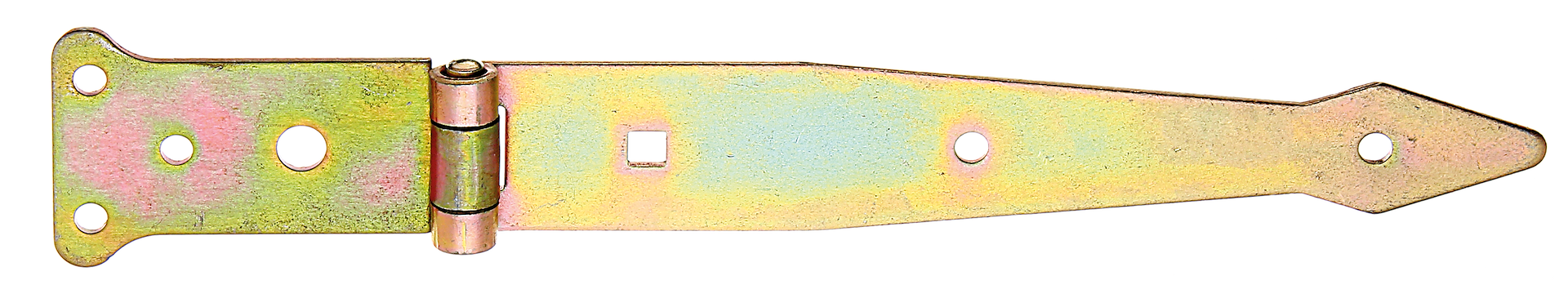 Werfgehänge, mit vernietetem Stift, Material: Stahl roh, Oberfläche: galvanisch gelb verzinkt, Bandlänge: 202 mm, Scharnierbreite: 77 mm, Scharnierlänge: 48 mm, Bandbreite: 35 mm, Ausführung: leicht, Materialstärke: 2,50 mm, Anzahl Löcher: 5 / 1 / 1, Loch: #6 / #9 / 7 x 7 mm