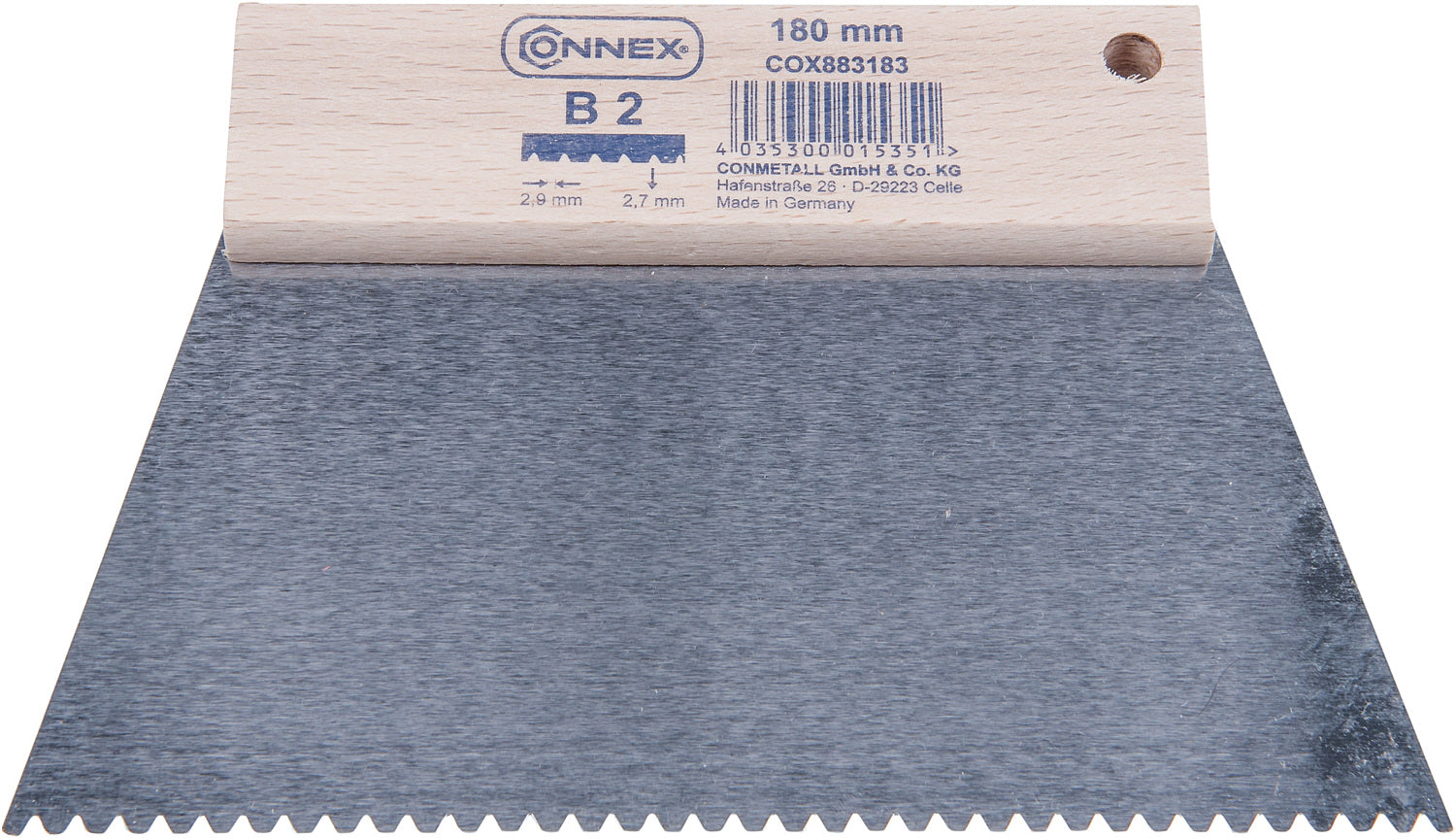 Spezialspachtel aus Stahl mit Holzgriff" Gezahnte Arbeitskante: grobe Zahnung B2 = 2,9 x 2,7 mm" Für das Auftragen von Fliesenkleber, Belagkleber, Styropurkleber